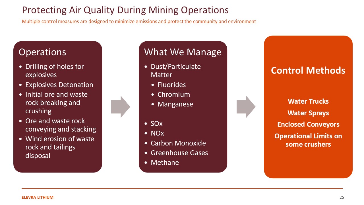 Protecting Air Quality During Mining Operations   Multiple control measures are designed to minimize emissions and protect the community and environment   ELEVRA LITHIUM  25