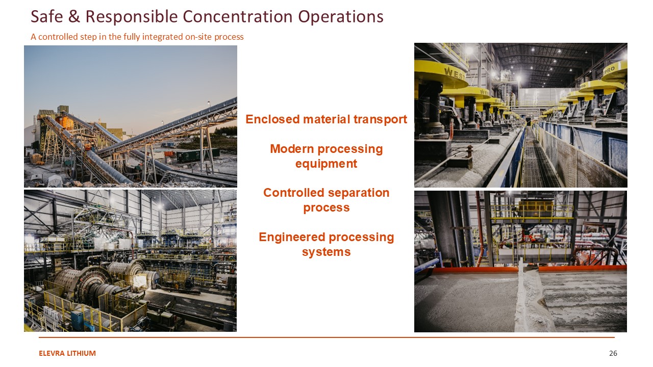 Safe & Responsible Concentration Operations  A controlled step in the fully integrated on-site process   ELEVRA LITHIUM  26  Enclosed material transport   Modern processing equipment  Controlled separation process  Engineered processing systems