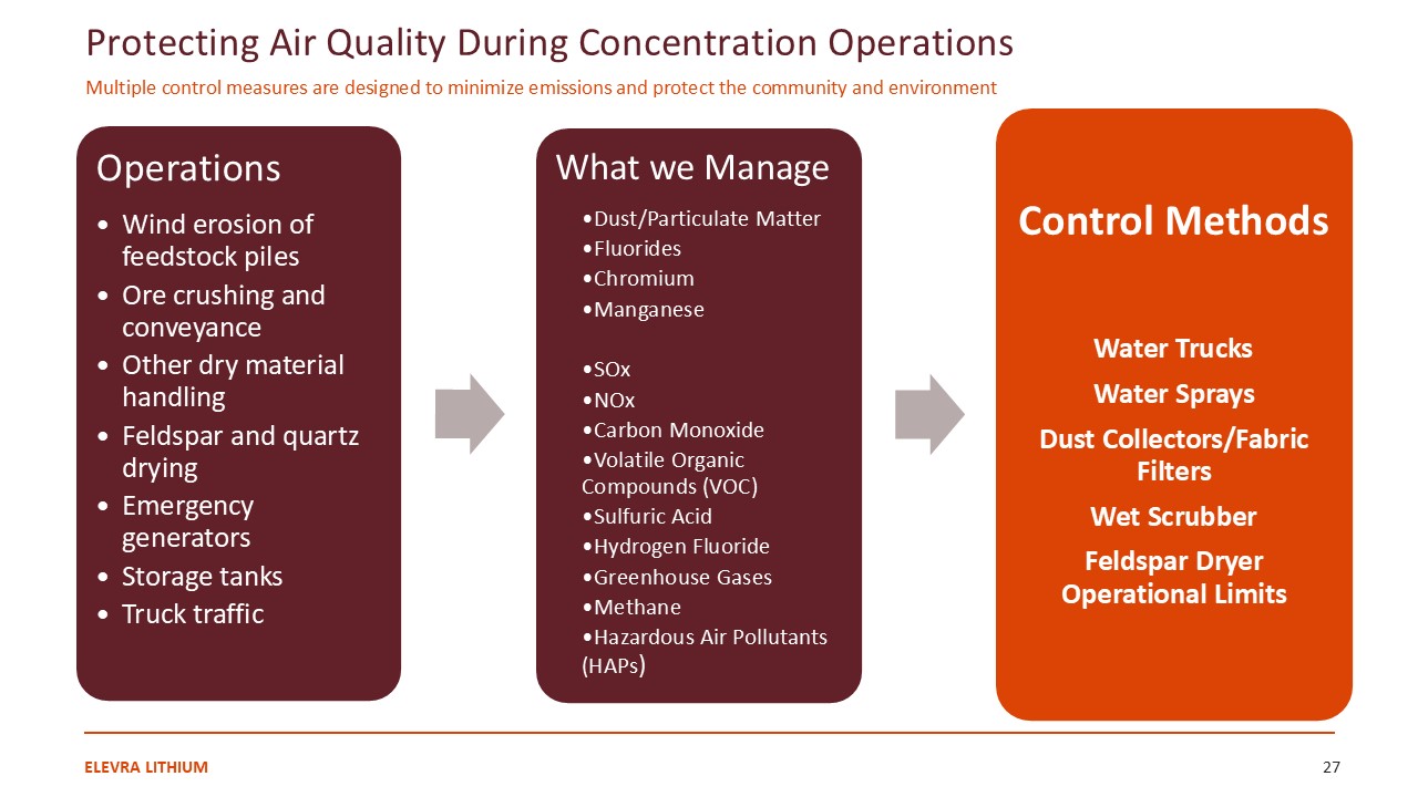 Protecting Air Quality During Concentration Operations  Multiple control measures are designed to minimize emissions and protect the community and environment   ELEVRA LITHIUM  27