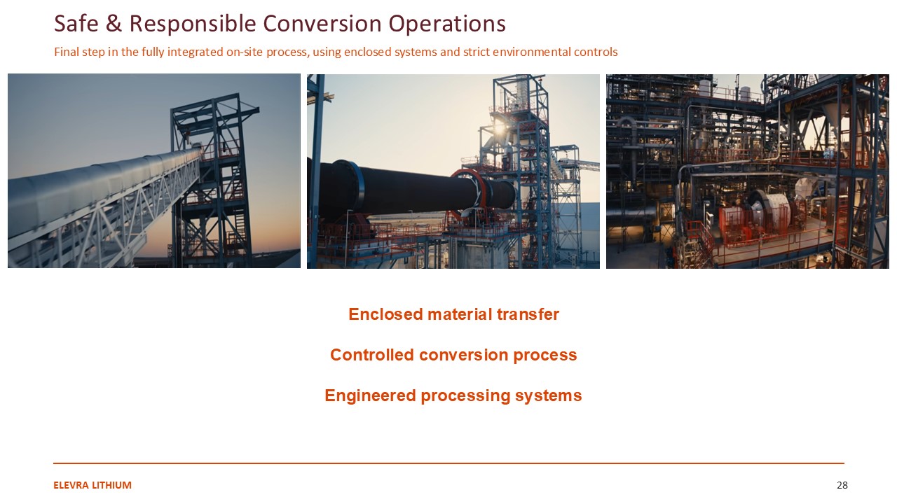 Safe & Responsible Conversion Operations   Final step in the fully integrated on-site process, using enclosed systems and strict environmental controls   ELEVRA LITHIUM  28  Enclosed material transfer   Controlled conversion process  Engineered processing systems