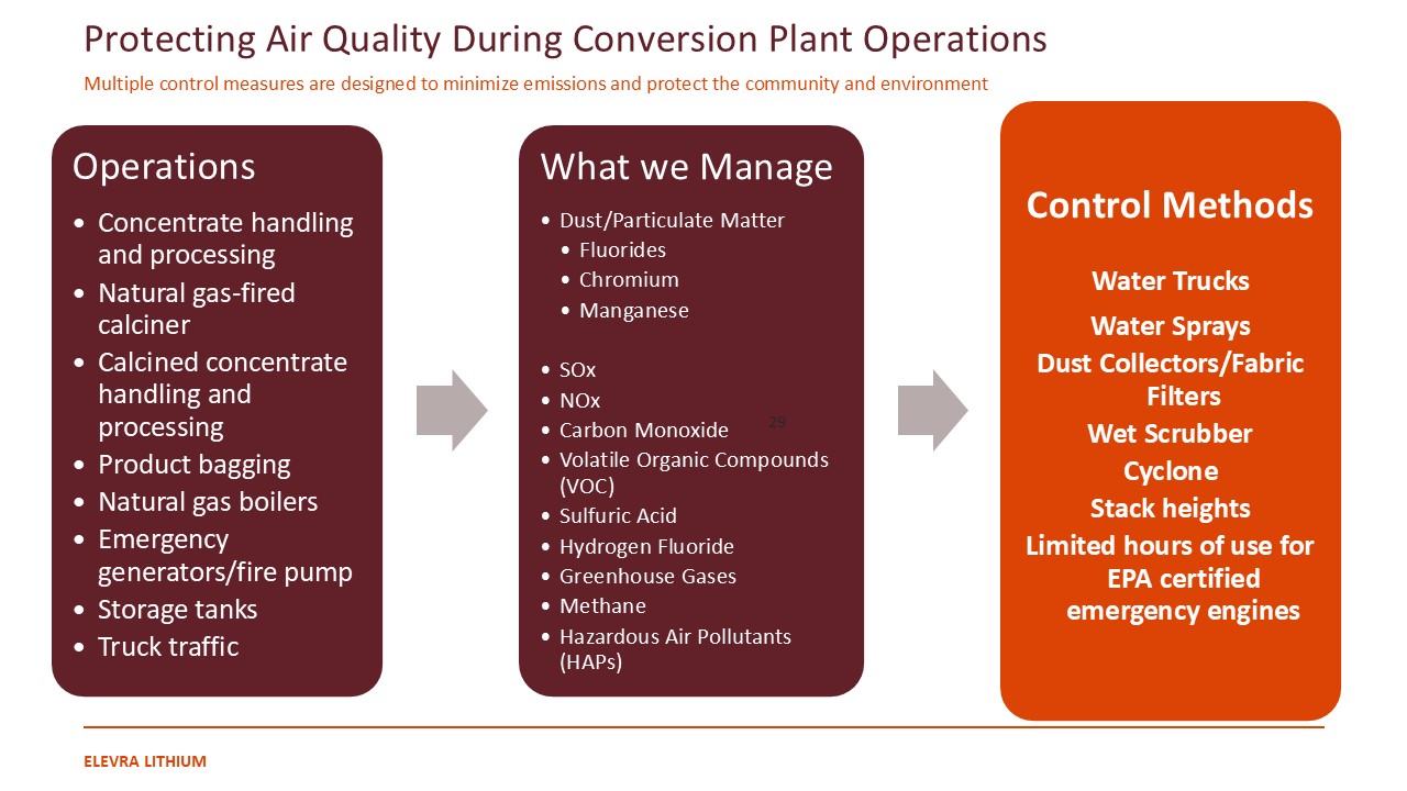 Protecting Air Quality During Conversion Plant Operations   Multiple control measures are designed to minimize emissions and protect the community and environment   ELEVRA LITHIUM  29
