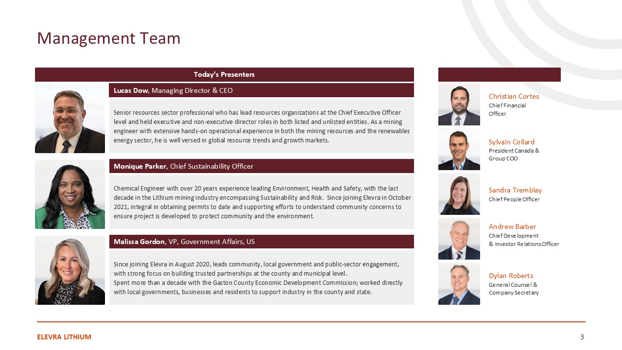 ELEVRA LITHIUM  3  Senior resources sector professional who has lead resources organizations at the Chief Executive Officer level and held executive and non-executive director roles in both listed and unlisted entities. As a mining engineer with extensive hands-on operational experience in both the mining resources and the renewables energy sector, he is well versed in global resource trends and growth markets.  Lucas Dow, Managing Director & CEO  Chemical Engineer with over 20 years experience leading Environment, Health and Safety, with the last decade in the Lithium mining industry encompassing Sustainability and Risk. Since joining Elevra in October 2021, integral in obtaining permits to date and supporting efforts to understand community concerns to ensure project is developed to protect community and the environment.  Monique Parker, Chief Sustainability Officer  Since joining Elevra in August 2020, leads community, local government and public-sector engagement, with strong focus on building trusted partnerships at the county and municipal level.   Spent more than a decade with the Gaston County Economic Development Commission; worked directly with local governments, businesses and residents to support industry in the county and state.   Malissa Gordon, VP, Government Affairs, US  Christian Cortes  Chief Financial  Officer  Dylan Roberts   General Counsel & Company Secretary  Sylvain Collard President Canada & Group COO  Andrew Barber   Chief Development   & Investor Relations Officer  Sandra Tremblay   Chief People Officer  Management Team  Today’s Presenters