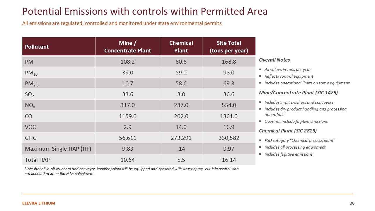 Pollutant  Mine /Concentrate Plant  Chemical  Plant  Site Total  (tons per year)  PM  108.2  60.6  168.8  PM10  39.0  59.0  98.0  PM2.5  10.7  58.6  69.3  SO2  33.6  3.0  36.6  NOx  317.0  237.0  554.0  CO  1159.0  202.0  1361.0  VOC  2.9  14.0  16.9  GHG  56,611  273,291  330,582  Maximum Single HAP (HF)  9.83  .14  9.97  Total HAP  10.64  5.5  16.14  Overall Notes  All values in tons per year  Reflects control equipment  Includes operational limits on some equipment  Mine/Concentrate Plant (SIC 1479)  Includes in-pit crushers and conveyors  Includes dry product handling and processing operations  Does not include fugitive emissions  Chemical Plant (SIC 2819)  PSD category “Chemical process plant”  Includes all processing equipment  Includes fugitive emissions  Note that all in-pit crushers and conveyor transfer points will be equipped and operated with water spray, but this control was not accounted for in the PTE calculation.  Potential Emissions with controls within Permitted Area   All emissions are regulated, controlled and monitored under state environmental permits  ELEVRA LITHIUM  30