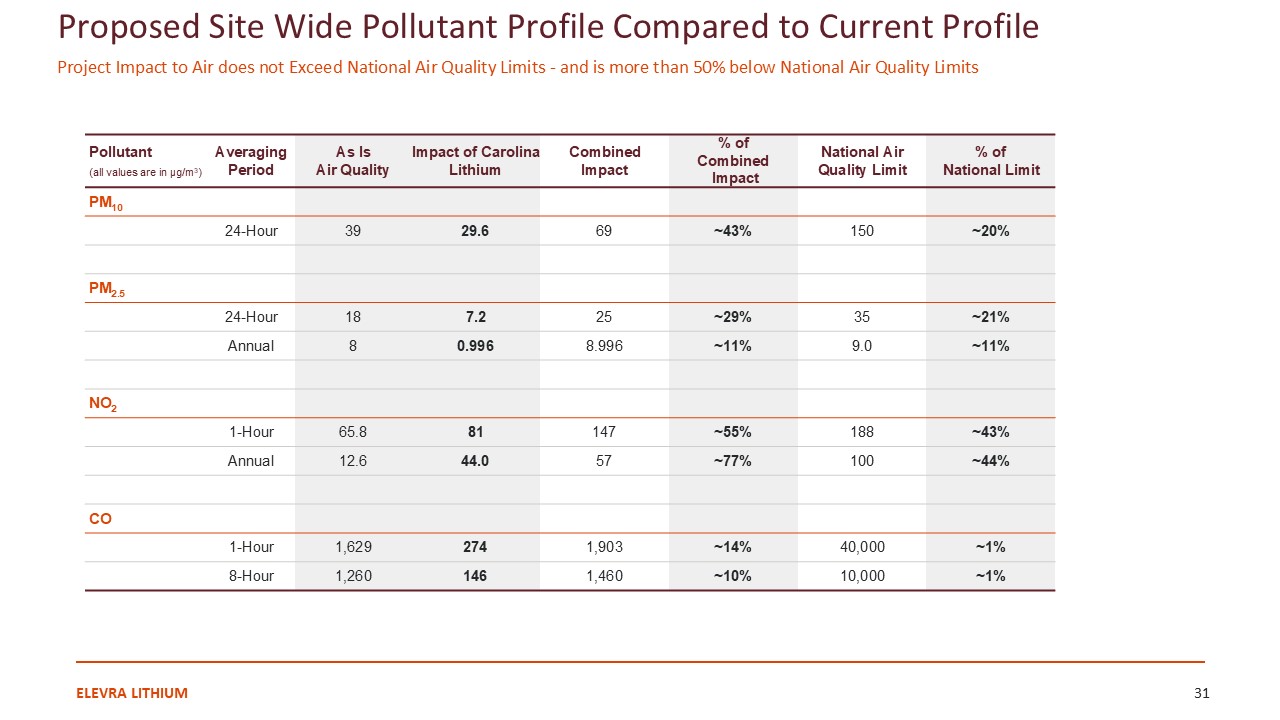 Proposed Site Wide Pollutant Profile Compared to Current Profile  Project Impact to Air does not Exceed National Air Quality Limits - and is more than 50% below National Air Quality Limits  ELEVRA LITHIUM  31   Pollutant   (all values are in μg/m3)  Averaging  Period  As Is  Air Quality  Impact of Carolina Lithium  Combined  Impact  % of   Combined    Impact  National Air   Quality Limit  % of   National Limit   PM10  24-Hour  39  29.6  69  ~43%  150  ~20%   PM2.5  24-Hour  18  7.2  25  ~29%  35  ~21%  Annual  8  0.996  8.996  ~11%  9.0  ~11%   NO2  1-Hour  65.8  81  147  ~55%  188  ~43%  Annual  12.6  44.0  57  ~77%  100  ~44%   CO  1-Hour  1,629  274  1,903  ~14%  40,000  ~1%  8-Hour  1,260  146  1,460  ~10%  10,000  ~1%