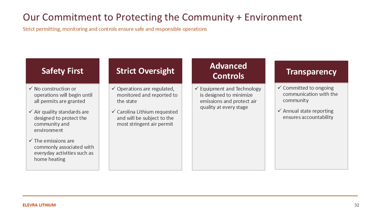 Our Commitment to Protecting the Community + Environment   Strict permitting, monitoring and controls ensure safe and responsible operations   ELEVRA LITHIUM  32