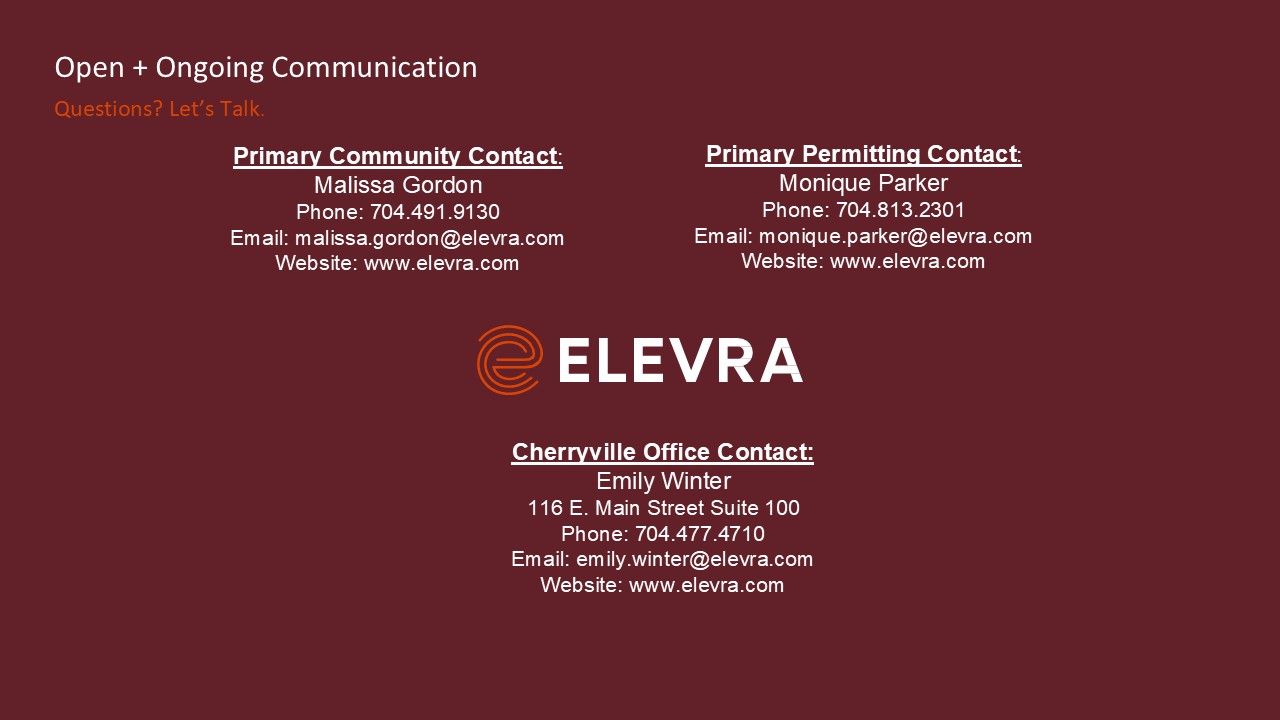 Primary Community Contact:  Malissa Gordon  Phone: 704.491.9130  Email: malissa.gordon@elevra.com  Website: www.elevra.com  Open + Ongoing Communication   Questions? Let’s Talk.   Primary Permitting Contact:  Monique Parker   Phone: 704.813.2301  Email: monique.parker@elevra.com  Website: www.elevra.com  Cherryville Office Contact:  Emily Winter   116 E. Main Street Suite 100  Phone: 704.477.4710  Email: emily.winter@elevra.com  Website: www.elevra.com