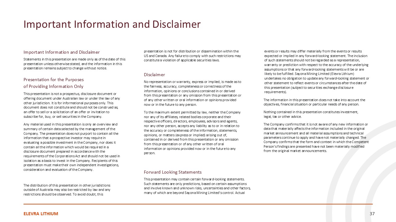 Important Information and Disclaimer  ELEVRA LITHIUM  37  Important Information and Disclaimer  Statements in this presentation are made only as of the date of this presentation unless otherwise stated, and the information in this presentation remains subject to change without notice.  Presentation for the Purposes of Providing Information Only  This presentation is not a prospectus, disclosure document or offering document under Australian law or under the law of any other jurisdiction. It is for informational purposes only. This document does not constitute and should not be construed as, an offer to sell or a solicitation of an offer or invitation to subscribe for, buy, or sell securities in the Company.  Any material used in this presentation is only an overview and summary of certain data selected by the management of the Company. The presentation does not purport to contain all the information that a prospective investor may require in evaluating a possible investment in the Company, nor does it contain all the information which would be required in a disclosure document prepared in accordance with the requirements of the Corporations Act and should not be used in isolation as a basis to invest in the Company. Recipients of this presentation must make their own independent investigations, consideration and evaluation of the Company.  The distribution of this presentation in other jurisdictions outside of Australia may also be restricted by law and any restrictions should be observed. To avoid doubt, this presentation is not for distribution or dissemination within the US and Canada. Any failure to comply with such restrictions may constitute a violation of applicable securities laws.  Disclaimer  No representation or warranty, express or implied, is made as to the fairness, accuracy, completeness or correctness of the information, opinions or conclusions contained in or derived from this presentation or any omission from this presentation or of any other written or oral information or opinions provided now or in the future to any person.   To the maximum extent permitted by law, neither the Company nor any of its affiliates, related bodies corporate and their respective officers, directors, employees, advisors and agents, nor any other person, accepts any liability as to or in relation to the accuracy or completeness of the information, statements, opinions, or matters (express or implied) arising out of, contained in or derived from this presentation or any omission from this presentation or of any other written of oral information or opinions provided now or in the future to any person.  Forward Looking Statements  This presentation may contain certain forward-looking statements. Such statements are only predictions, based on certain assumptions and involve known and unknown risks, uncertainties and other factors, many of which are beyond Sayona Mining Limited’s control. Actual events or results may differ materially from the events or results expected or implied in any forward-looking statement. The inclusion of such statements should not be regarded as a representation, warranty or prediction with respect to the accuracy of the underlying assumptions or that any forward-looking statements will be or are likely to be fulfilled. Sayona Mining Limited (Elevra Lithium) undertakes no obligation to update any forward-looking statement or other statement to reflect events or circumstances after the date of this presentation (subject to securities exchange disclosure requirements).  The information in this presentation does not take into account the objectives, financial situation or particular needs of any person.  Nothing contained in this presentation constitutes investment, legal, tax or other advice.  The Company confirms that it is not aware of any new information or data that materially affects the information included in the original market announcement and all material assumptions and technical parameters continue to apply and have not materially changed. The Company confirms that the form and context in which the Competent Person’s findings are presented have not been materially modified from the original market announcements.