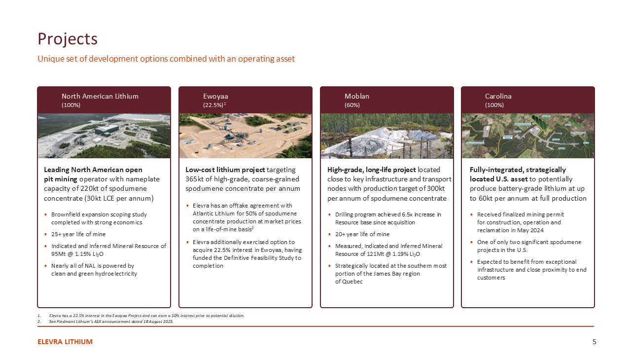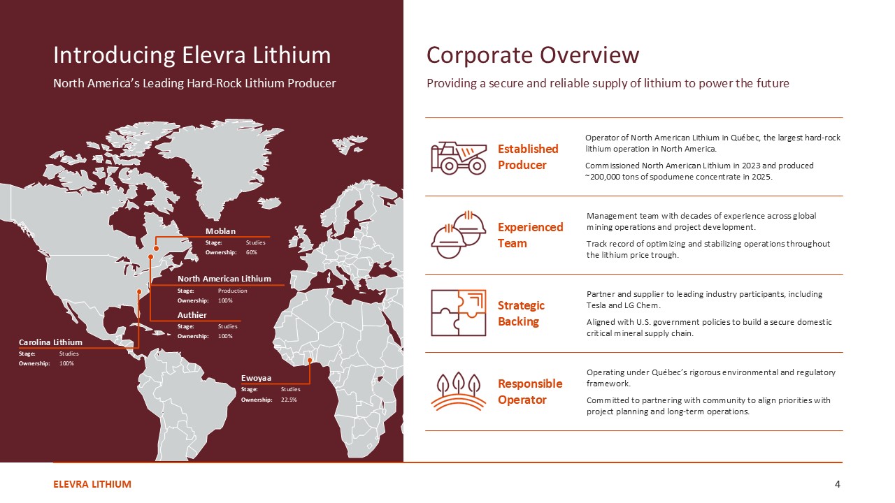 ELEVRA LITHIUM  4  Introducing Elevra Lithium  North America’s Leading Hard-Rock Lithium Producer  Operator of North American Lithium in Québec, the largest hard-rock lithium operation in North America.  Commissioned North American Lithium in 2023 and produced ~200,000 tons of spodumene concentrate in 2025.  Established Producer  Experienced Team  Strategic Backing  Management team with decades of experience across global mining operations and project development.  Track record of optimizing and stabilizing operations throughout the lithium price trough.  Partner and supplier to leading industry participants, including Tesla and LG Chem.  Aligned with U.S. government policies to build a secure domestic critical mineral supply chain.  North American Lithium  Stage:  Production  Ownership:  100%  Authier  Stage:  Studies  Ownership:  100%  Moblan  Stage:  Studies  Ownership:  60%  Carolina Lithium  Stage:  Studies  Ownership:  100%  Ewoyaa  Stage:  Studies  Ownership:  22.5%  Corporate Overview  Providing a secure and reliable supply of lithium to power the future  Responsible Operator  Operating under Québec’s rigorous environmental and regulatory framework.  Committed to partnering with community to align priorities with project planning and long-term operations.