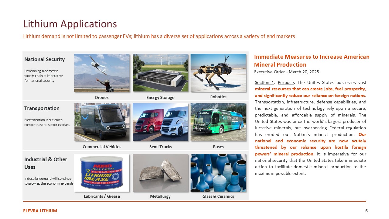 Lithium Applications  Lithium demand is not limited to passenger EVs; lithium has a diverse set of applications across a variety of end markets  ELEVRA LITHIUM  6  Transportation  Electrification is critical to compete as the sector evolves  Commercial Vehicles  Semi Trucks  Buses  National Security  Developing a domestic   supply chain is imperative   for national security  Drones  Energy Storage  Robotics  Industrial & Other Uses  Industrial demand will continue to grow as the economy expands  Lubricants / Grease  Metallurgy  Glass & Ceramics  Immediate Measures to Increase American Mineral Production  Executive Order - March 20, 2025  Section 1. Purpose. The Unites States possesses vast mineral resources that can create jobs, fuel prosperity, and significantly reduce our reliance on foreign nations. Transportation, infrastructure, defense capabilities, and the next generation of technology rely upon a secure, predictable, and affordable supply of minerals. The United States was once the world’s largest producer of lucrative minerals, but overbearing Federal regulation has eroded our Nation’s mineral production. Our national and economic security are now acutely threatened by our reliance upon hostile foreign powers’ mineral production. It is imperative for our national security that the United States take immediate action to facilitate domestic mineral production to the maximum possible extent.