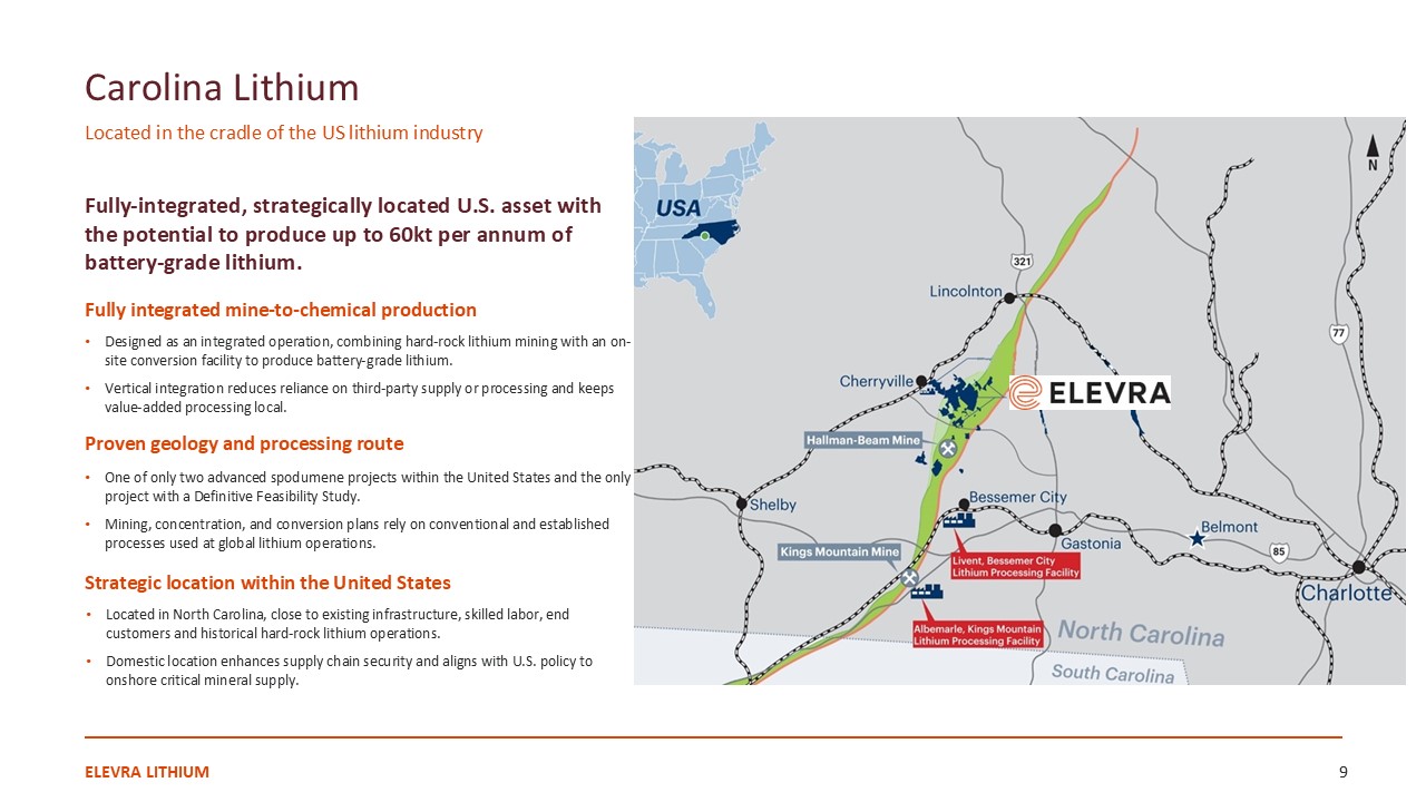 ELEVRA LITHIUM  9  Carolina Lithium  Located in the cradle of the US lithium industry  Fully-integrated, strategically located U.S. asset with the potential to produce up to 60kt per annum of battery-grade lithium.  Fully integrated mine-to-chemical production  Designed as an integrated operation, combining hard-rock lithium mining with an on-site conversion facility to produce battery-grade lithium.  Vertical integration reduces reliance on third-party supply or processing and keeps value-added processing local.  Proven geology and processing route  One of only two advanced spodumene projects within the United States and the only project with a Definitive Feasibility Study.  Mining, concentration, and conversion plans rely on conventional and established processes used at global lithium operations.  Strategic location within the United States  Located in North Carolina, close to existing infrastructure, skilled labor, end customers and historical hard-rock lithium operations.  Domestic location enhances supply chain security and aligns with U.S. policy to onshore critical mineral supply.