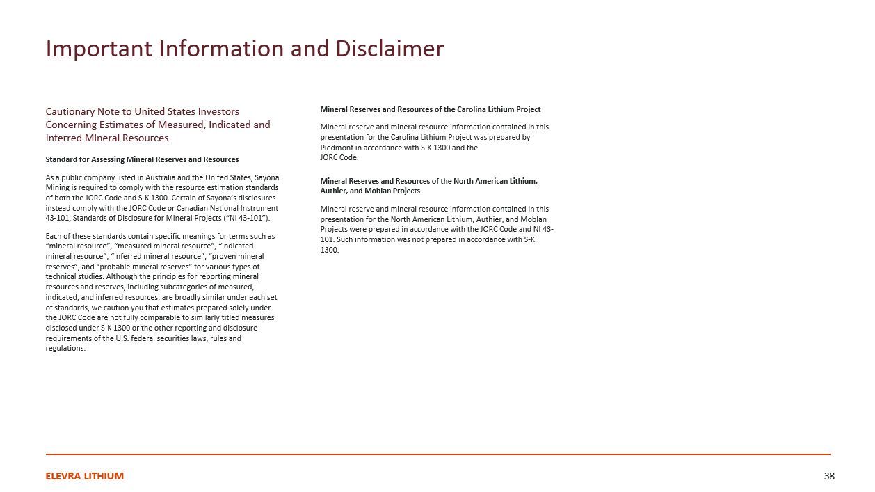 Important Information and Disclaimer  ELEVRA LITHIUM  38  Cautionary Note to United States Investors Concerning Estimates of Measured, Indicated and Inferred Mineral Resources  Standard for Assessing Mineral Reserves and Resources  As a public company listed in Australia and the United States, Sayona Mining is required to comply with the resource estimation standards of both the JORC Code and S-K 1300. Certain of Sayona’s disclosures instead comply with the JORC Code or Canadian National Instrument 43-101, Standards of Disclosure for Mineral Projects (“NI 43-101”).  Each of these standards contain specific meanings for terms such as “mineral resource”, “measured mineral resource”, “indicated mineral resource”, “inferred mineral resource”, “proven mineral reserves”, and “probable mineral reserves” for various types of technical studies. Although the principles for reporting mineral resources and reserves, including subcategories of measured, indicated, and inferred resources, are broadly similar under each set of standards, we caution you that estimates prepared solely under the JORC Code are not fully comparable to similarly titled measures disclosed under S-K 1300 or the other reporting and disclosure requirements of the U.S. federal securities laws, rules and regulations.  Mineral Reserves and Resources of the Carolina Lithium Project  Mineral reserve and mineral resource information contained in this presentation for the Carolina Lithium Project was prepared by Piedmont in accordance with S-K 1300 and the JORC Code.  Mineral Reserves and Resources of the North American Lithium, Authier, and Moblan Projects  Mineral reserve and mineral resource information contained in this presentation for the North American Lithium, Authier, and Moblan Projects were prepared in accordance with the JORC Code and NI 43-101. Such information was not prepared in accordance with S-K 1300.