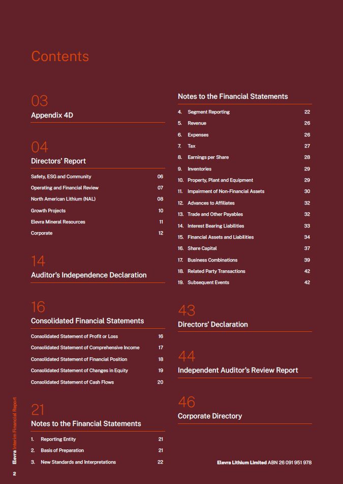 03  Appendix 4D  04  Directors’ Report  Safety, ESG and Community  06  Operating and Financial Review  07  North American Lithium (NAL)  08  Growth Projects  10  Elevra Mineral Resources  11  Corporate  12  14  Auditor's Independence Declaration  16  Consolidated Financial Statements  Consolidated Statement of Profit or Loss  16  Consolidated Statement of Comprehensive Income  17  Consolidated Statement of Financial Position  18  Consolidated Statement of Changes in Equity  19  Consolidated Statement of Cash Flows  20  21  21  21  Notes to the Financial Statements  Reporting Entity  Basis of Preparation  New Standards and Interpretations  22  22  26  26  27  28  29  29  30  32  32  33  34  37  39  Notes to the Financial Statements  Segment Reporting  Revenue  Expenses  Tax  Earnings per Share  Inventories  Property, Plant and Equipment  Impairment of Non-Financial Assets  Advances to Affiliates  Trade and Other Payables  Interest Bearing Liabilities  Financial Assets and Liabilities  Share Capital  Business Combinations  Related Party Transactions  42  19. Subsequent Events  42  43  Directors’ Declaration  44  Independent Auditor’s Review Report  46  Corporate Directory  Contents  Elevra Lithium Limited ABN 26 091 951 978  Elevra Interim Financial Report  2
