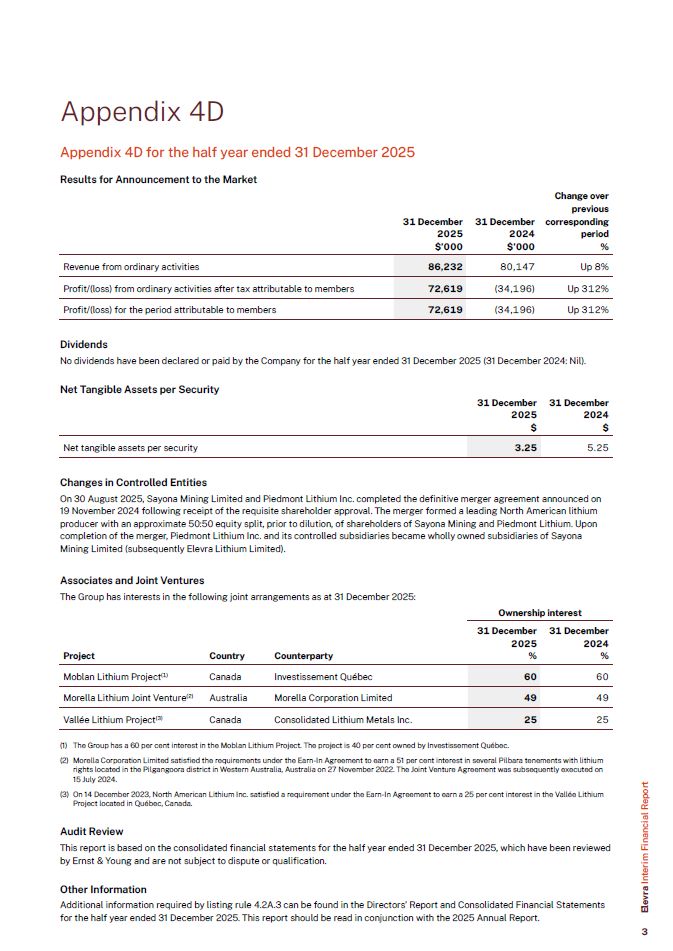Appendix 4D  Appendix 4D for the half year ended 31 December 2025  Results for Announcement to the Market  Revenue from ordinary activities  86,232  80,147 Up 8%  Profit/(loss) from ordinary activities after tax attributable to members  72,619  (34,196) Up 312%  Profit/(loss) for the period attributable to members  72,619  (34,196) Up 312%  31 December  2025  $’000  31 December  2024  $’000  Change over  previous  corresponding  period  %  Dividends  No dividends have been declared or paid by the Company for the half year ended 31 December 2025 (31 December 2024: Nil).  Net Tangible Assets per Security  31 December  31 December  2025  $  2024  $  Net tangible assets per security  3.25  5.25  Changes in Controlled Entities  On 30 August 2025, Sayona Mining Limited and Piedmont Lithium Inc. completed the definitive merger agreement announced on 19 November 2024 following receipt of the requisite shareholder approval. The merger formed a leading North American lithium producer with an approximate 50:50 equity split, prior to dilution, of shareholders of Sayona Mining and Piedmont Lithium. Upon completion of the merger, Piedmont Lithium Inc. and its controlled subsidiaries became wholly owned subsidiaries of Sayona Mining Limited (subsequently Elevra Lithium Limited).  Associates and Joint Ventures  The Group has interests in the following joint arrangements as at 31 December 2025:  Ownership interest  Moblan Lithium Project(1)  Canada  Investissement Québec  60  60  Morella Lithium Joint Venture(2)  Australia  Morella Corporation Limited  49  49  Vallée Lithium Project(3)  Canada  Consolidated Lithium Metals Inc.  25  25  Project  Country  Counterparty  31 December  2025  %  31 December  2024  %  Elevra Interim Financial Report  The Group has a 60 per cent interest in the Moblan Lithium Project. The project is 40 per cent owned by Investissement Québec.  Morella Corporation Limited satisfied the requirements under the Earn-In Agreement to earn a 51 per cent interest in several Pilbara tenements with lithium rights located in the Pilgangoora district in Western Australia, Australia on 27 November 2022. The Joint Venture Agreement was subsequently executed on 15 July 2024.  On 14 December 2023, North American Lithium Inc. satisfied a requirement under the Earn-In Agreement to earn a 25 per cent interest in the Vallée Lithium Project located in Québec, Canada.  Audit Review  This report is based on the consolidated financial statements for the half year ended 31 December 2025, which have been reviewed by Ernst & Young and are not subject to dispute or qualification.  Other Information  Additional information required by listing rule 4.2A.3 can be found in the Directors’ Report and Consolidated Financial Statements for the half year ended 31 December 2025. This report should be read in conjunction with the 2025 Annual Report.  3