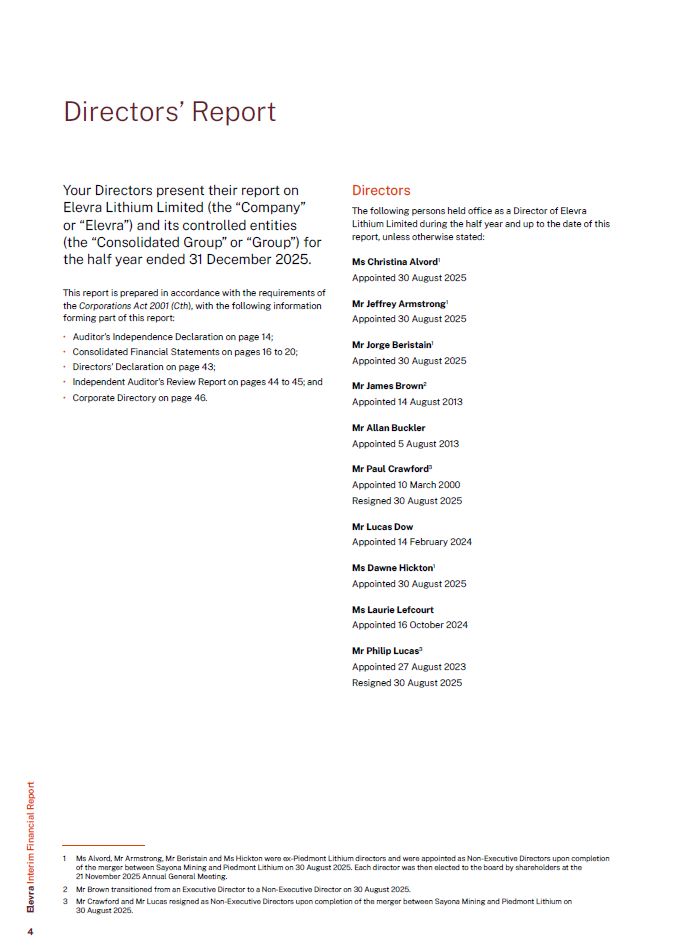 Your Directors present their report on Elevra Lithium Limited (the “Company” or “Elevra”) and its controlled entities (the “Consolidated Group” or “Group”) for the half year ended 31 December 2025.  This report is prepared in accordance with the requirements of the Corporations Act 2001 (Cth), with the following information forming part of this report:  Auditor’s Independence Declaration on page 14;  Consolidated Financial Statements on pages 16 to 20;  Directors’ Declaration on page 43;  Independent Auditor’s Review Report on pages 44 to 45; and  Corporate Directory on page 46.  Directors  The following persons held office as a Director of Elevra Lithium Limited during the half year and up to the date of this report, unless otherwise stated:  Ms Christina Alvord1  Appointed 30 August 2025  Mr Jeffrey Armstrong1  Appointed 30 August 2025  Mr Jorge Beristain1  Appointed 30 August 2025  Mr James Brown2  Appointed 14 August 2013  Mr Allan Buckler  Appointed 5 August 2013  Mr Paul Crawford3  Appointed 10 March 2000  Resigned 30 August 2025  Mr Lucas Dow  Appointed 14 February 2024  Ms Dawne Hickton1  Appointed 30 August 2025  Ms Laurie Lefcourt  Appointed 16 October 2024  Mr Philip Lucas3  Appointed 27 August 2023  Resigned 30 August 2025  Directors’ Report  Elevra Interim Financial Report   Ms Alvord, Mr Armstrong, Mr Beristain and Ms Hickton were ex-Piedmont Lithium directors and were appointed as Non-Executive Directors upon completion of the merger between Sayona Mining and Piedmont Lithium on 30 August 2025. Each director was then elected to the board by shareholders at the  21 November 2025 Annual General Meeting.  Mr Brown transitioned from an Executive Director to a Non-Executive Director on 30 August 2025.   Mr Crawford and Mr Lucas resigned as Non-Executive Directors upon completion of the merger between Sayona Mining and Piedmont Lithium on 30 August 2025.  4