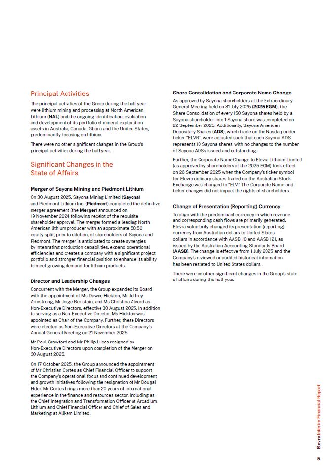 Principal Activities  The principal activities of the Group during the half year were lithium mining and processing at North American Lithium (NAL) and the ongoing identification, evaluation and development of its portfolio of mineral exploration assets in Australia, Canada, Ghana and the United States, predominantly focusing on lithium.  There were no other significant changes in the Group’s principal activities during the half year.  Significant Changes in the State of Affairs  Merger of Sayona Mining and Piedmont Lithium  On 30 August 2025, Sayona Mining Limited (Sayona)  and Piedmont Lithium Inc. (Piedmont) completed the definitive merger agreement (the Merger) announced on  19 November 2024 following receipt of the requisite shareholder approval. The merger formed a leading North American lithium producer with an approximate 50:50 equity split, prior to dilution, of shareholders of Sayona and Piedmont. The merger is anticipated to create synergies  by integrating production capabilities, expand operational efficiencies and creates a company with a significant project portfolio and stronger financial position to enhance its ability to meet growing demand for lithium products.  Director and Leadership Changes  Concurrent with the Merger, the Group expanded its Board with the appointment of Ms Dawne Hickton, Mr Jeffrey Armstrong, Mr Jorge Beristain, and Ms Christina Alvord as  Non-Executive Directors, effective 30 August 2025. In addition to serving as a Non-Executive Director, Ms Hickton was appointed as Chair of the Company. Further, these Directors were elected as Non-Executive Directors at the Company’s Annual General Meeting on 21 November 2025.  Mr Paul Crawford and Mr Philip Lucas resigned as  Non-Executive Directors upon completion of the Merger on 30 August 2025.  On 17 October 2025, the Group announced the appointment of Mr Christian Cortes as Chief Financial Officer to support the Company’s operational focus and continued development and growth initiatives following the resignation of Mr Dougal Elder. Mr Cortes brings more than 20 years of international experience in the finance and resources sector, including as the Chief Integration and Transformation Officer at Arcadium Lithium and Chief Financial Officer and Chief of Sales and Marketing at Allkem Limited.  Share Consolidation and Corporate Name Change  As approved by Sayona shareholders at the Extraordinary General Meeting held on 31 July 2025 (2025 EGM), the Share Consolidation of every 150 Sayona shares held by a Sayona shareholder into 1 Sayona share was completed on 22 September 2025. Additionally, Sayona American Depositary Shares (ADS), which trade on the Nasdaq under ticker "ELVR", were adjusted such that each Sayona ADS represents 10 Sayona shares, with no changes to the number of Sayona ADSs issued and outstanding.  Further, the Corporate Name Change to Elevra Lithium Limited (as approved by shareholders at the 2025 EGM) took effect  on 26 September 2025 when the Company’s ticker symbol for Elevra ordinary shares traded on the Australian Stock Exchange was changed to “ELV.” The Corporate Name and ticker changes did not impact the rights of shareholders.  Change of Presentation (Reporting) Currency  To align with the predominant currency in which revenue and corresponding cash flows are primarily generated, Elevra voluntarily changed its presentation (reporting) currency from Australian dollars to United States dollars in accordance with AASB 10 and AASB 121, as issued by the Australian Accounting Standards Board  (AASB). The change is effective from 1 July 2025 and the Company’s reviewed or audited historical information has been restated to United States dollars.  There were no other significant changes in the Group’s state of affairs during the half year.  Elevra Interim Financial Report  5