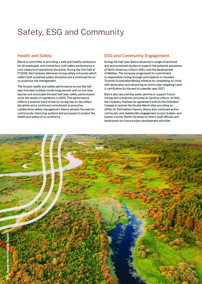 Health and Safety  Elevra is committed to providing a safe and healthy workplace for all employees and contractors, with safety performance a core measure of operational discipline. During the first half of FY2026, the Company delivered strong safety outcomes which reflect both sustained safety discipline and a continued focus on proactive risk management.  The Group’s health and safety performance across the half year included multiple month-long periods with no lost time injuries and concluded the best half year safety performance since the restart of operations in 2023. This performance reflects a positive trend driven by strong day-to-day safety discipline and a continued commitment to proactive, collaborative safety management. Elevra remains focused on continuously improving systems and processes to protect the health and safety of its workforce.  ESG and Community Engagement  During the half year, Elevra advanced a range of technical and environmental studies to support the potential expansion of North American Lithium (NAL) and the development  of Moblan. The Company progressed its commitment to responsible mining through participation in Canada’s  Towards Sustainable Mining initiative by completing an initial self-declaration and advancing an action plan targeting Level A certification by the end of calendar year 2027.  Elevra also secured key water permits to support future mining and conversion activities at Carolina Lithium. At NAL, the Company finalised an agreement with Ducks Unlimited Canada to restore the Double Marsh dike, providing an offset for fish habitat impacts. Elevra also continued active  community and stakeholder engagement across Québec and Gaston County (North Carolina) to inform local officials and landowners on future project development activities.  Safety, ESG and Community  6  Elevra Interim Financial Report