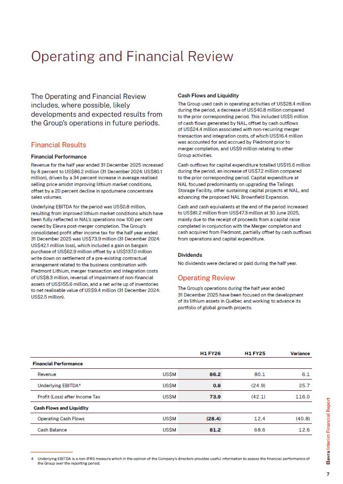 The Operating and Financial Review includes, where possible, likely developments and expected results from the Group’s operations in future periods.  Financial Results  Financial Performance  Revenue for the half year ended 31 December 2025 increased by 8 percent to US$86.2 million (31 December 2024: US$80.1 million), driven by a 34 percent increase in average realised selling price amidst improving lithium market conditions, offset by a 20 percent decline in spodumene concentrate sales volumes.  Underlying EBITDA for the period was US$0.8 million, resulting from improved lithium market conditions which have been fully reflected in NAL’s operations now 100 per cent owned by Elevra post-merger completion. The Group’s consolidated profit after income tax for the half year ended 31 December 2025 was US$73.9 million (31 December 2024: US$42.1 million loss), which included a gain on bargain purchase of US$62.9 million offset by a US$137.0 million write down on settlement of a pre-existing contractual arrangement related to the business combination with Piedmont Lithium, merger transaction and integration costs of US$8.3 million, reversal of impairment of non-financial assets of US$155.6 million, and a net write up of inventories to net realisable value of US$9.4 million (31 December 2024: US$2.5 million).  Cash Flows and Liquidity  The Group used cash in operating activities of US$28.4 million during the period, a decrease of US$40.8 million compared  to the prior corresponding period. This included US$5 million of cash flows generated by NAL, offset by cash outflows  of US$24.4 million associated with non-recurring merger transaction and integration costs, of which US$16.4 million was accounted for and accrued by Piedmont prior to merger completion, and US$9 million relating to other Group activities.  Cash outflows for capital expenditure totalled US$15.6 million during the period, an increase of US$7.2 million compared  to the prior corresponding period. Capital expenditure at NAL focused predominantly on upgrading the Tailings Storage Facility, other sustaining capital projects at NAL, and advancing the proposed NAL Brownfield Expansion.  Cash and cash equivalents at the end of the period increased to US$81.2 million from US$47.3 million at 30 June 2025, mainly due to the receipt of proceeds from a capital raise completed in conjunction with the Merger completion and cash acquired from Piedmont, partially offset by cash outflows from operations and capital expenditure.  Dividends  No dividends were declared or paid during the half year.  Operating Review  The Group’s operations during the half year ended  31 December 2025 have been focused on the development of its lithium assets in Québec and working to advance its portfolio of global growth projects.  Operating and Financial Review  Revenue  US$M  86.2  80.1  6.1  Underlying EBITDA4  US$M  0.8  (24.9)  25.7  Profit (Loss) after Income Tax  US$M  73.9  (42.1)  116.0  Operating Cash Flows  US$M  (28.4)  12.4  (40.8)  Cash Balance  US$M  81.2  68.6  12.6  H1 FY26  H1 FY25  Variance  Financial Performance  Cash Flows and Liquidity  Elevra Interim Financial Report  4 Underlying EBITDA is a non-IFRS measure which in the opinion of the Company’s directors provides useful information to assess the financial performance of the Group over the reporting period.  7