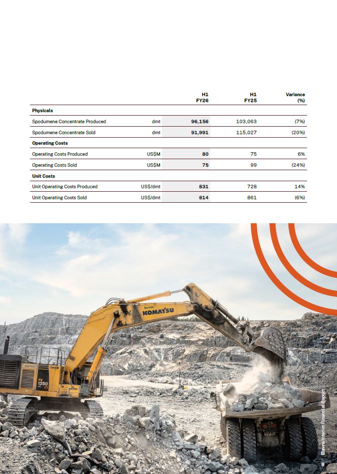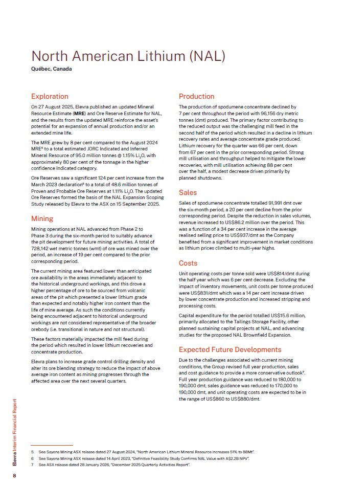 Exploration  On 27 August 2025, Elevra published an updated Mineral Resource Estimate (MRE) and Ore Reserve Estimate for NAL, and the results from the updated MRE reinforce the asset’s potential for an expansion of annual production and/or an extended mine life.  The MRE grew by 8 per cent compared to the August 2024 MRE5 to a total estimated JORC Indicated and Inferred  Mineral Resource of 95.0 million tonnes @ 1.15% Li O, with  2  approximately 80 per cent of the tonnage in the higher  confidence Indicated category.  Ore Reserves saw a significant 124 per cent increase from the March 2023 declaration6 to a total of 48.6 million tonnes of Proven and Probable Ore Reserves at 1.11% Li2O. The updated Ore Reserves formed the basis of the NAL Expansion Scoping Study released by Elevra to the ASX on 15 September 2025.  Mining  Mining operations at NAL advanced from Phase 2 to Phase 3 during the six-month period to suitably advance the pit development for future mining activities. A total of  728,142 wet metric tonnes (wmt) of ore was mined over the period, an increase of 19 per cent compared to the prior corresponding period.  The current mining area featured lower than anticipated ore availability in the areas immediately adjacent to  the historical underground workings, and this drove a higher percentage of ore to be sourced from volcanic areas of the pit which presented a lower lithium grade than expected and notably higher iron content than the life of mine average. As such the conditions currently being encountered adjacent to historical underground workings are not considered representative of the broader orebody (i.e. transitional in nature and not structural).  These factors materially impacted the mill feed during the period which resulted in lower lithium recoveries and concentrate production.  Elevra plans to increase grade control drilling density and alter its ore blending strategy to reduce the impact of above average iron content as mining progresses through the affected area over the next several quarters.  Production  The production of spodumene concentrate declined by 7 per cent throughout the period with 96,156 dry metric  tonnes (dmt) produced. The primary factor contributing to the reduced output was the challenging mill feed in the  second half of the period which resulted in a decline in lithium recovery rates and average concentrate grade produced.  Lithium recovery for the quarter was 66 per cent, down from 67 per cent in the prior corresponding period. Strong mill utilisation and throughput helped to mitigate the lower recoveries, with mill utilisation achieving 88 per cent  over the half, a modest decrease driven primarily by planned shutdowns.  Sales  Sales of spodumene concentrate totalled 91,991 dmt over the six-month period, a 20 per cent decline from the prior  corresponding period. Despite the reduction in sales volumes, revenue increased to US$86.2 million over the period. This was a function of a 34 per cent increase in the average realised selling price to US$937/dmt as the Company benefited from a significant improvement in market conditions as lithium prices climbed to multi-year highs.  Costs  Unit operating costs per tonne sold were US$814/dmt during the half year which was 6 per cent decrease. Excluding the impact of inventory movements, unit costs per tonne produced were US$831/dmt which was a 14 per cent increase driven  by lower concentrate production and increased stripping and processing costs.  Capital expenditure for the period totalled US$15.6 million, primarily allocated to the Tailings Storage Facility, other planned sustaining capital projects at NAL, and advancing studies for the proposed NAL Brownfield Expansion.  Expected Future Developments  Due to the challenges associated with current mining conditions, the Group revised full year production, sales and cost guidance to provide a more conservative outlook7. Full year production guidance was reduced to 180,000 to 190,000 dmt, sales guidance was reduced to 170,000 to 190,000 dmt, and unit operating costs are expected to be in the range of US$860 to US$880/dmt.  North American Lithium (NAL)  Québec, Canada  Elevra Interim Financial Report  See Sayona Mining ASX release dated 27 August 2024, “North American Lithium Mineral Resource increases 51% to 88Mt”.  See Sayona Mining ASX release dated 14 April 2023, “Definitive Feasibility Study Confirms NAL Value with A$2.2B NPV”.  See ASX release dated 28 January 2026, “December 2025 Quarterly Activities Report”.  8