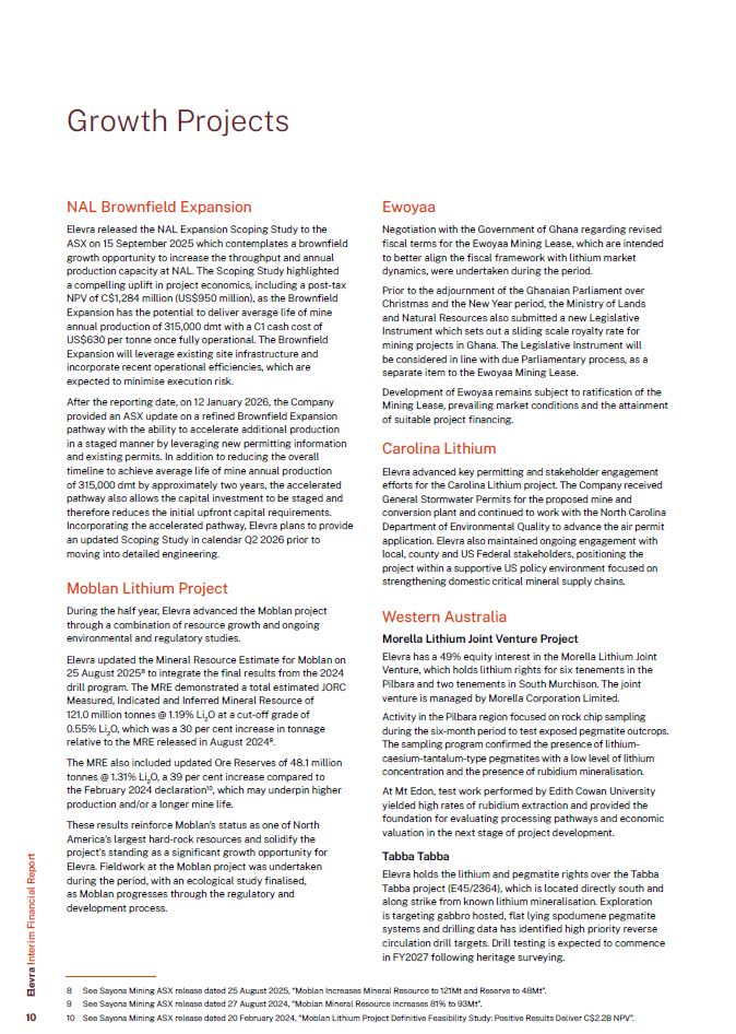 NAL Brownfield Expansion  Elevra released the NAL Expansion Scoping Study to the ASX on 15 September 2025 which contemplates a brownfield growth opportunity to increase the throughput and annual production capacity at NAL. The Scoping Study highlighted  a compelling uplift in project economics, including a post-tax NPV of C$1,284 million (US$950 million), as the Brownfield Expansion has the potential to deliver average life of mine annual production of 315,000 dmt with a C1 cash cost of US$630 per tonne once fully operational. The Brownfield Expansion will leverage existing site infrastructure and incorporate recent operational efficiencies, which are expected to minimise execution risk.  After the reporting date, on 12 January 2026, the Company provided an ASX update on a refined Brownfield Expansion pathway with the ability to accelerate additional production in a staged manner by leveraging new permitting information and existing permits. In addition to reducing the overall timeline to achieve average life of mine annual production  of 315,000 dmt by approximately two years, the accelerated pathway also allows the capital investment to be staged and therefore reduces the initial upfront capital requirements. Incorporating the accelerated pathway, Elevra plans to provide an updated Scoping Study in calendar Q2 2026 prior to moving into detailed engineering.  Moblan Lithium Project  During the half year, Elevra advanced the Moblan project through a combination of resource growth and ongoing environmental and regulatory studies.  Elevra updated the Mineral Resource Estimate for Moblan on 25 August 20258 to integrate the final results from the 2024 drill program. The MRE demonstrated a total estimated JORC Measured, Indicated and Inferred Mineral Resource of  121.0 million tonnes @ 1.19% Li2O at a cut-off grade of 0.55% Li2O, which was a 30 per cent increase in tonnage relative to the MRE released in August 20249.  The MRE also included updated Ore Reserves of 48.1 million  tonnes @ 1.31% Li O, a 39 per cent increase compared to  2  the February 2024 declaration10, which may underpin higher  production and/or a longer mine life.  These results reinforce Moblan’s status as one of North America’s largest hard-rock resources and solidify the project’s standing as a significant growth opportunity for Elevra. Fieldwork at the Moblan project was undertaken during the period, with an ecological study finalised,  as Moblan progresses through the regulatory and development process.  See Sayona Mining ASX release dated 25 August 2025, “Moblan Increases Mineral Resource to 121Mt and Reserve to 48Mt”.  See Sayona Mining ASX release dated 27 August 2024, “Moblan Mineral Resource increases 81% to 93Mt”.  See Sayona Mining ASX release dated 20 February 2024, “Moblan Lithium Project Definitive Feasibility Study: Positive Results Deliver C$2.2B NPV”.  Ewoyaa  Negotiation with the Government of Ghana regarding revised fiscal terms for the Ewoyaa Mining Lease, which are intended to better align the fiscal framework with lithium market dynamics, were undertaken during the period.  Prior to the adjournment of the Ghanaian Parliament over Christmas and the New Year period, the Ministry of Lands and Natural Resources also submitted a new Legislative Instrument which sets out a sliding scale royalty rate for mining projects in Ghana. The Legislative Instrument will be considered in line with due Parliamentary process, as a separate item to the Ewoyaa Mining Lease.  Development of Ewoyaa remains subject to ratification of the Mining Lease, prevailing market conditions and the attainment of suitable project financing.  Carolina Lithium  Elevra advanced key permitting and stakeholder engagement efforts for the Carolina Lithium project. The Company received General Stormwater Permits for the proposed mine and conversion plant and continued to work with the North Carolina Department of Environmental Quality to advance the air permit application. Elevra also maintained ongoing engagement with local, county and US Federal stakeholders, positioning the project within a supportive US policy environment focused on strengthening domestic critical mineral supply chains.  Western Australia  Morella Lithium Joint Venture Project  Elevra has a 49% equity interest in the Morella Lithium Joint Venture, which holds lithium rights for six tenements in the Pilbara and two tenements in South Murchison. The joint venture is managed by Morella Corporation Limited.  Activity in the Pilbara region focused on rock chip sampling during the six-month period to test exposed pegmatite outcrops. The sampling program confirmed the presence of lithium-caesium-tantalum-type pegmatites with a low level of lithium concentration and the presence of rubidium mineralisation.  At Mt Edon, test work performed by Edith Cowan University yielded high rates of rubidium extraction and provided the foundation for evaluating processing pathways and economic valuation in the next stage of project development.  Tabba Tabba  Elevra holds the lithium and pegmatite rights over the Tabba Tabba project (E45/2364), which is located directly south and along strike from known lithium mineralisation. Exploration  is targeting gabbro hosted, flat lying spodumene pegmatite systems and drilling data has identified high priority reverse circulation drill targets. Drill testing is expected to commence in FY2027 following heritage surveying.  Growth Projects  Elevra Interim Financial Report  10