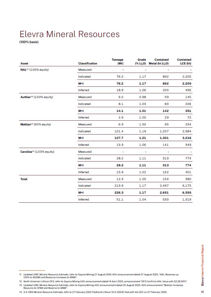 Tonnage  Grade  Contained  Contained  Asset  Classification  (Mt)  (% Li2O)  Metal (kt Li2O)  LCE (kt)  NAL11 (100% equity)  Measured  –  –  –  –  Indicated  76.2  1.17  892  2,205  M+I  76.2  1.17  892  2,205  Inferred  18.9  1.06  200  495  Authier12 (100% equity)  Measured  6.0  0.98  59  145  Indicated  8.1  1.03  83  206  M+I  14.1  1.01  142  351  Inferred  2.9  1.00  29  72  Moblan13 (60% equity)  Measured  6.3  1.50  95  234  Indicated  101.4  1.19  1,207  2,984  M+I  107.7  1.21  1,301  3,218  Inferred  13.3  1.06  141  349  Carolina14 (100% equity)  Measured  –  –  –  –  Indicated  28.2  1.11  313  774  M+I  28.2  1.11  313  774  Inferred  15.9  1.02  162  401  Total  Measured  12.3  1.25  154  380  Indicated  213.9  1.17  2,497  6,175  M+I  226.3  1.17  2,651  6,555  Inferred  51.1  1.04  533  1,319  Updated JORC Mineral Resource Estimate, refer to Sayona Mining 27 August 2025 ASX announcement dated 27 August 2025, “NAL Reserves up 124% to 48.6Mt and Resource increases to 95Mt”.  North American Lithium DFS, refer to Sayona Mining ASX announcement dated 14 April 2023, announcement “DFS Confirms NAL Value with $2.2B NPV”.  Updated JORC Mineral Resource Estimate, refer to Sayona Mining ASX announcement dated 25 August 2025, ASX announcement “Moblan Increases Resource to 121Mt and Reserve to 48Mt”.  S-K 1300 Mineral Resource Estimate, refer to 27 February 2025 Piedmont Lithium 10-K (2024) filed with the SEC on 27 February 2025.  Elevra Mineral Resources  (100% basis)  Elevra Interim Financial Report  11