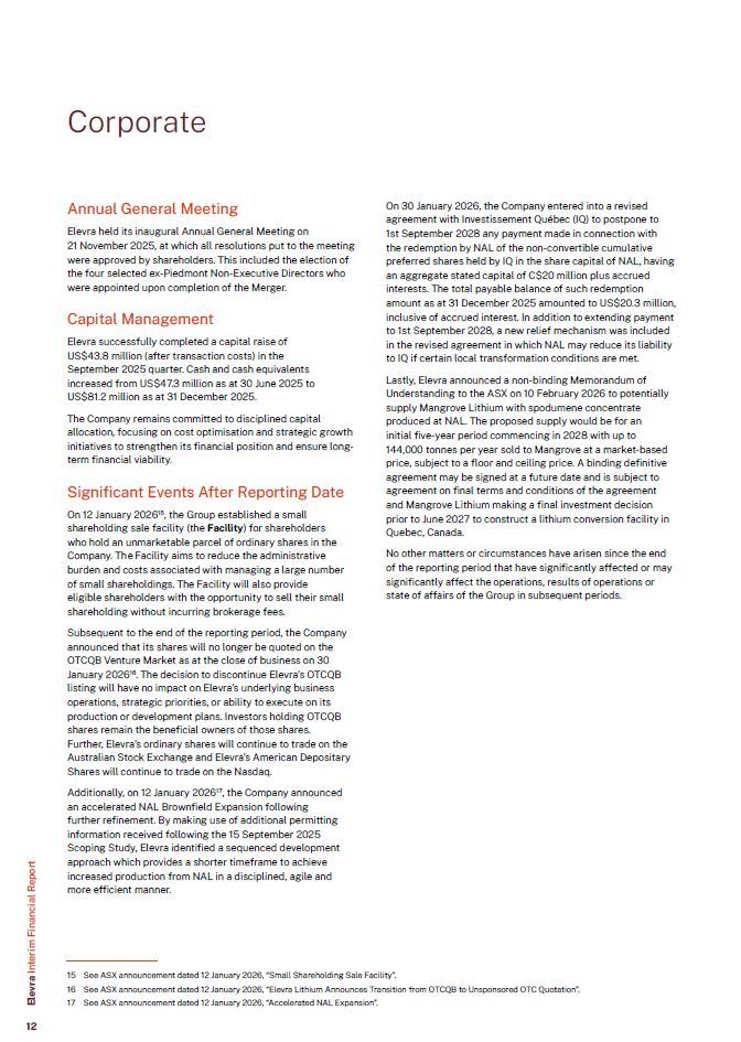 Annual General Meeting  Elevra held its inaugural Annual General Meeting on  21 November 2025, at which all resolutions put to the meeting were approved by shareholders. This included the election of the four selected ex-Piedmont Non-Executive Directors who were appointed upon completion of the Merger.  Capital Management  Elevra successfully completed a capital raise of US$43.8 million (after transaction costs) in the September 2025 quarter. Cash and cash equivalents increased from US$47.3 million as at 30 June 2025 to US$81.2 million as at 31 December 2025.  The Company remains committed to disciplined capital allocation, focusing on cost optimisation and strategic growth initiatives to strengthen its financial position and ensure long-term financial viability.  Significant Events After Reporting Date  On 12 January 202615, the Group established a small shareholding sale facility (the Facility) for shareholders who hold an unmarketable parcel of ordinary shares in the Company. The Facility aims to reduce the administrative burden and costs associated with managing a large number of small shareholdings. The Facility will also provide eligible shareholders with the opportunity to sell their small shareholding without incurring brokerage fees.  Subsequent to the end of the reporting period, the Company announced that its shares will no longer be quoted on the OTCQB Venture Market as at the close of business on 30 January 202616. The decision to discontinue Elevra’s OTCQB listing will have no impact on Elevra’s underlying business operations, strategic priorities, or ability to execute on its production or development plans. Investors holding OTCQB shares remain the beneficial owners of those shares.  Further, Elevra’s ordinary shares will continue to trade on the Australian Stock Exchange and Elevra’s American Depositary Shares will continue to trade on the Nasdaq.  Additionally, on 12 January 202617, the Company announced an accelerated NAL Brownfield Expansion following further refinement. By making use of additional permitting information received following the 15 September 2025 Scoping Study, Elevra identified a sequenced development approach which provides a shorter timeframe to achieve increased production from NAL in a disciplined, agile and more efficient manner.  On 30 January 2026, the Company entered into a revised agreement with Investissement Québec (IQ) to postpone to 1st September 2028 any payment made in connection with the redemption by NAL of the non-convertible cumulative  preferred shares held by IQ in the share capital of NAL, having an aggregate stated capital of C$20 million plus accrued interests. The total payable balance of such redemption amount as at 31 December 2025 amounted to US$20.3 million, inclusive of accrued interest. In addition to extending payment to 1st September 2028, a new relief mechanism was included in the revised agreement in which NAL may reduce its liability to IQ if certain local transformation conditions are met.  Lastly, Elevra announced a non-binding Memorandum of Understanding to the ASX on 10 February 2026 to potentially supply Mangrove Lithium with spodumene concentrate produced at NAL. The proposed supply would be for an initial five-year period commencing in 2028 with up to 144,000 tonnes per year sold to Mangrove at a market-based price, subject to a floor and ceiling price. A binding definitive agreement may be signed at a future date and is subject to agreement on final terms and conditions of the agreement and Mangrove Lithium making a final investment decision prior to June 2027 to construct a lithium conversion facility in Quebec, Canada.  No other matters or circumstances have arisen since the end of the reporting period that have significantly affected or may significantly affect the operations, results of operations or state of affairs of the Group in subsequent periods.  Corporate  Elevra Interim Financial Report  See ASX announcement dated 12 January 2026, “Small Shareholding Sale Facility”.  See ASX announcement dated 12 January 2026, “Elevra Lithium Announces Transition from OTCQB to Unsponsored OTC Quotation”.  See ASX announcement dated 12 January 2026, “Accelerated NAL Expansion”.  12