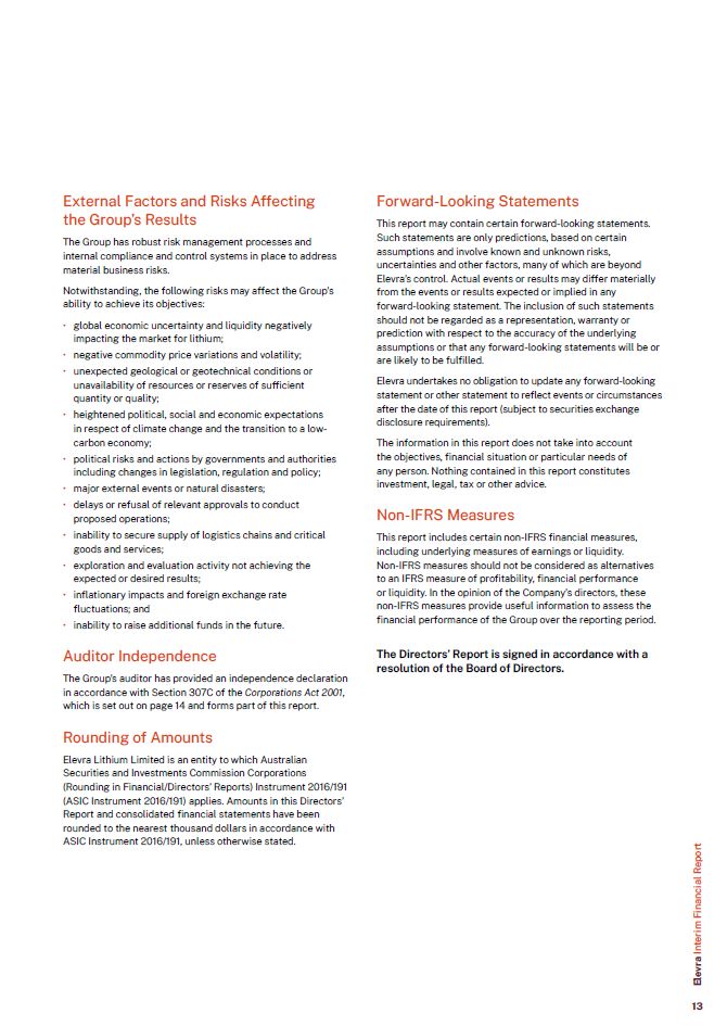 External Factors and Risks Affecting the Group’s Results  The Group has robust risk management processes and internal compliance and control systems in place to address material business risks.  Notwithstanding, the following risks may affect the Group’s ability to achieve its objectives:  global economic uncertainty and liquidity negatively impacting the market for lithium;  negative commodity price variations and volatility;  unexpected geological or geotechnical conditions or unavailability of resources or reserves of sufficient quantity or quality;  heightened political, social and economic expectations in respect of climate change and the transition to a low- carbon economy;  political risks and actions by governments and authorities including changes in legislation, regulation and policy;  major external events or natural disasters;  delays or refusal of relevant approvals to conduct proposed operations;  inability to secure supply of logistics chains and critical goods and services;  exploration and evaluation activity not achieving the expected or desired results;  inflationary impacts and foreign exchange rate fluctuations; and  inability to raise additional funds in the future.  Auditor Independence  The Group’s auditor has provided an independence declaration in accordance with Section 307C of the Corporations Act 2001, which is set out on page 14 and forms part of this report.  Rounding of Amounts  Elevra Lithium Limited is an entity to which Australian Securities and Investments Commission Corporations (Rounding in Financial/Directors’ Reports) Instrument 2016/191 (ASIC Instrument 2016/191) applies. Amounts in this Directors’ Report and consolidated financial statements have been rounded to the nearest thousand dollars in accordance with ASIC Instrument 2016/191, unless otherwise stated.  Forward-Looking Statements  This report may contain certain forward-looking statements. Such statements are only predictions, based on certain assumptions and involve known and unknown risks, uncertainties and other factors, many of which are beyond Elevra’s control. Actual events or results may differ materially from the events or results expected or implied in any  forward-looking statement. The inclusion of such statements should not be regarded as a representation, warranty or prediction with respect to the accuracy of the underlying assumptions or that any forward-looking statements will be or are likely to be fulfilled.  Elevra undertakes no obligation to update any forward-looking statement or other statement to reflect events or circumstances after the date of this report (subject to securities exchange disclosure requirements).  The information in this report does not take into account the objectives, financial situation or particular needs of any person. Nothing contained in this report constitutes investment, legal, tax or other advice.  Non-IFRS Measures  This report includes certain non-IFRS financial measures, including underlying measures of earnings or liquidity.  Non-IFRS measures should not be considered as alternatives to an IFRS measure of profitability, financial performance  or liquidity. In the opinion of the Company’s directors, these non-IFRS measures provide useful information to assess the financial performance of the Group over the reporting period.  The Directors’ Report is signed in accordance with a resolution of the Board of Directors.  Elevra Interim Financial Report  13