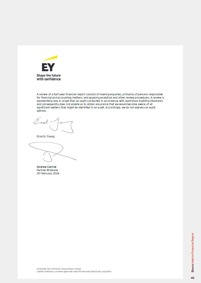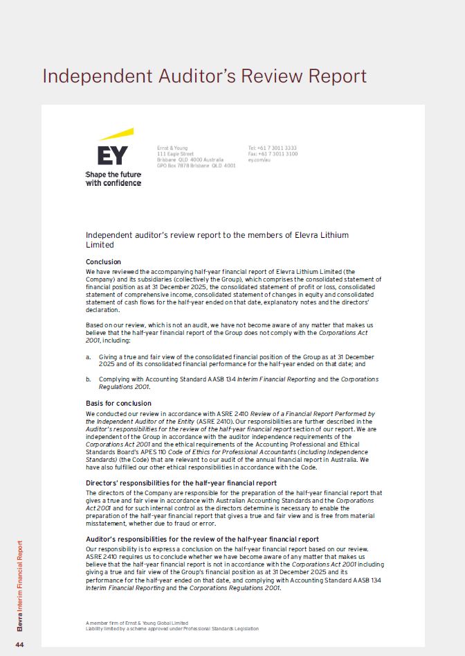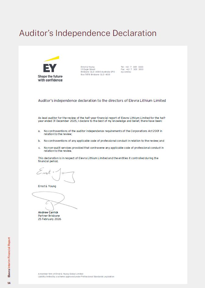 Auditor’s Independence Declaration  A member firm of Ernst & Young Global Limited  Liability limited by a scheme approved under Professional Standards Legislation  Ernst & Young 111 Eagle Street  Brisbane QLD 4000 Australia GPO Box 7878 Brisbane QLD 4001  Tel: +61 7 3011 3333  Fax: +61 7 3011 3100  ey.com/au  Auditor’s independence declaration to the directors of Elevra Lithium Limited  As lead auditor for the review of the half-year financial report of Elevra Lithium Limited for the half-year ended 31 December 2025, I declare to the best of my knowledge and belief, there have been:  No contraventions of the auditor independence requirements of the Corporations Act 2001 in relation to the review;  No contraventions of any applicable code of professional conduct in relation to the review; and  No non-audit services provided that contravene any applicable code of professional conduct in relation to the review.  This declaration is in respect of Elevra Lithium Limited and the entities it controlled during the financial period.  Ernst & Young  Andrew Carrick Partner Brisbane 25 February 2026  Elevra Interim Financial Report  14