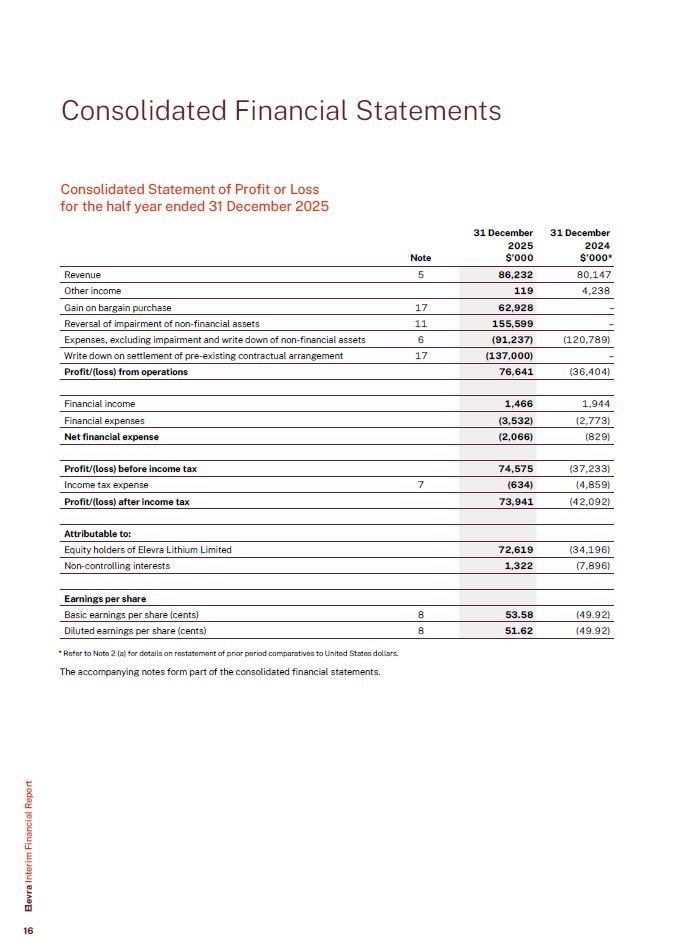 Consolidated Statement of Profit or Loss for the half year ended 31 December 2025  Revenue  5  86,232  80,147  Other income  119  4,238  Gain on bargain purchase  17  62,928  –  Reversal of impairment of non-financial assets  11  155,599  –  Expenses, excluding impairment and write down of non-financial assets  6  (91,237)  (120,789)  Write down on settlement of pre-existing contractual arrangement  17  (137,000)  –  Profit/(loss) from operations  76,641  (36,404)  Financial income  1,466  1,944  Financial expenses  (3,532)  (2,773)  Net financial expense  (2,066)  (829)  Profit/(loss) before income tax  74,575  (37,233)  Income tax expense  7  (634)  (4,859)  Profit/(loss) after income tax  73,941  (42,092)  Attributable to:  Equity holders of Elevra Lithium Limited  72,619  (34,196)  Non-controlling interests  1,322  (7,896)  Earnings per share  Basic earnings per share (cents)  8  53.58  (49.92)  Diluted earnings per share (cents)  8  51.62  (49.92)  Note  31 December  2025  $’000  31 December  2024  $’000*  * Refer to Note 2 (a) for details on restatement of prior period comparatives to United States dollars.  The accompanying notes form part of the consolidated financial statements.  Consolidated Financial Statements  Elevra Interim Financial Report  16