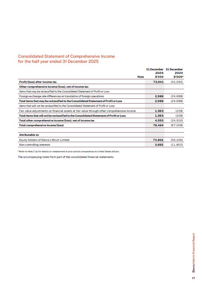Consolidated Statement of Comprehensive Income for the half year ended 31 December 2025  Profit/(loss) after income tax  73,941  (42,092)  Other comprehensive income/(loss), net of income tax  Items that may be reclassified to the Consolidated Statement of Profit or Loss:  Foreign exchange rate differences on translation of foreign operations  2,988  (24,688)  Total items that may be reclassified to the Consolidated Statement of Profit or Loss  2,988  (24,688)  Items that will not be reclassified to the Consolidated Statement of Profit or Loss:  Fair value adjustments on financial assets at fair value through other comprehensive income  1,565  (228)  Total items that will not be reclassified to the Consolidated Statement of Profit or Loss  1,565  (228)  Total other comprehensive income/(loss), net of income tax  4,553  (24,916)  Total comprehensive income/(loss)  78,494  (67,008)  Attributable to:  Equity holders of Elevra Lithium Limited  74,802  (55,206)  Non-controlling interests  3,692  (11,802)  Note  2025  $’000  31 December 31 December  2024  $’000*  * Refer to Note 2 (a) for details on restatement of prior period comparatives to United States dollars.  The accompanying notes form part of the consolidated financial statements.  Elevra Interim Financial Report  17
