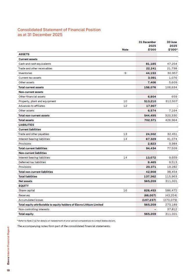 Consolidated Statement of Financial Position as at 31 December 2025  ASSETS  Current assets  Cash and cash equivalents  81,185  47,254  Trade and other receivables  22,241  21,738  Inventories  9  44,153  30,957  Current tax assets  3,091  1,076  Other assets  7,406  5,609  Total current assets  158,076  106,634  Non-current assets  Other financial assets  6,804  659  Property, plant and equipment  10  513,210  312,507  Advances to affiliates  12  17,907  –  Other assets  6,574  7,164  Total non-current assets  544,495  320,330  Total assets  702,571  426,964  LIABILITIES  Current liabilities  Trade and other payables  13  24,302  32,451  Interest bearing liabilities  14  67,329  41,074  Provisions  2,823  3,984  Total current liabilities  94,454  77,509  Non-current liabilities  Interest bearing liabilities  14  13,072  9,659  Deferred tax liabilities  9,465  9,513  Provisions  20,371  19,282  Total non-current liabilities  42,908  38,454  Total liabilities  137,362  115,963  Net assets  565,209  311,001  EQUITY  Share capital  16  828,453  586,472  Reserves  (66,007)  (43,204)  Accumulated losses  (197,237)  (270,079)  Total equity attributable to equity holders of Elevra Lithium Limited  565,209  273,189  Non-controlling interests  –  37,812  Total equity  565,209  311,001  Note  31 December  2025  $’000  30 June  2025  $’000*  * Refer to Note 2 (a) for details on restatement of prior period comparatives to United States dollars.  The accompanying notes form part of the consolidated financial statements.  Elevra Interim Financial Report  18