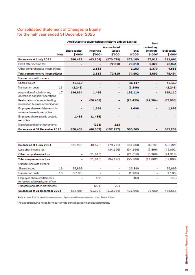 Consolidated Statement of Changes in Equity for the half year ended 31 December 2025  Balance as at 1 July 2025  586,472  (43,204)  (270,079)  273,189  37,812  311,001  Profit after income tax  –  –  72,619  72,619  1,322  73,941  Other comprehensive income/(loss)  –  2,183  –  2,183  2,370  4,553  Total comprehensive income/(loss)  –  2,183  72,619  74,802  3,692  78,494  Transactions with owners:  Shares issued  46,117  –  –  46,117  –  46,117  Transaction costs  16  (2,246)  –  –  (2,246)  –  (2,246)  Acquisition of subsidiaries, operations and joint operations  17  196,624  1,486  –  198,110  –  198,110  Reallocation of non-controlling interest on business combination  –  (26,459)  –  (26,459)  (41,504)  (67,963)  Employee share entitlements for unvested awards, net of tax  –  1,696  –  1,696  –  1,696  Employee share awards vested, net of tax  1,486  (1,486)  –  –  –  –  Transfers and other movements  –  (223)  223  –  –  –  Balance as at 31 December 2025  828,453  (66,007)  (197,237)  565,209  –  565,209  Balance as at 1 July 2024  561,903  (40,572)  (79,771)  441,560  88,761  530,321  Loss after income tax  –  –  (34,196)  (34,196)  (7,896)  (42,092)  Other comprehensive loss  –  (21,010)  –  (21,010)  (3,906)  (24,916)  Total comprehensive loss  –  (21,010)  (34,196)  (55,206)  (11,802)  (67,008)  Transactions with owners:  Shares issued  16  25,899  –  –  25,899  –  25,899  Transaction costs  16  (1,105)  –  –  (1,105)  –  (1,105)  Employee share entitlements for unvested awards, net of tax  –  458  –  458  –  458  Transfers and other movements  –  (201)  201  –  –  –  Balance as at 31 December 2024  586,697  (61,325)  (113,766)  411,606  76,959  488,565  Note  Attributable to equity holders of Elevra Lithium Limited  Non-  controlling  interests  $’000*  Total equity  $’000*  Share capital  $’000*  Reserves  $’000*  Accumulated  losses  $’000*  Total  $’000*  * Refer to Note 2 (a) for details on restatement of prior period comparatives to United States dollars.  The accompanying notes form part of the consolidated financial statements.  Elevra Interim Financial Report  19
