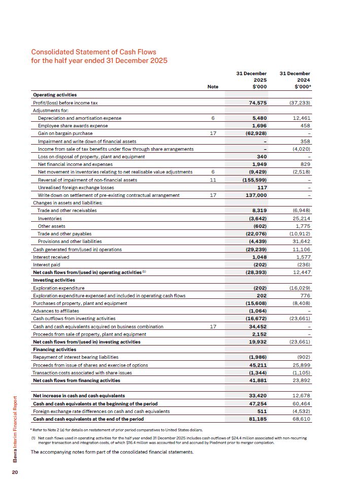 Consolidated Statement of Cash Flows  for the half year ended 31 December 2025  Operating activities  Profit/(loss) before income tax  74,575  (37,233)  Adjustments for:  Depreciation and amortisation expense  6  5,480  12,461  Employee share awards expense  1,696  458  Gain on bargain purchase  17  (62,928)  –  Impairment and write down of financial assets  –  358  Income from sale of tax benefits under flow through share arrangements  –  (4,020)  Loss on disposal of property, plant and equipment  340  –  Net financial income and expenses  1,949  829  Net movement in inventories relating to net realisable value adjustments  6  (9,429)  (2,518)  Reversal of impairment of non-financial assets  11  (155,599)  –  Unrealised foreign exchange losses  117  –  Write down on settlement of pre-existing contractual arrangement  17  137,000  –  Changes in assets and liabilities:  Trade and other receivables  8,319  (6,948)  Inventories  (3,642)  25,214  Other assets  (602)  1,775  Trade and other payables  (22,076)  (10,912)  Provisions and other liabilities  (4,439)  31,642  Cash generated from/(used in) operations  (29,239)  11,106  Interest received  1,048  1,577  Interest paid  (202)  (236)  Net cash flows from/(used in) operating activities (1)  (28,393)  12,447  Investing activities  Exploration expenditure  (202)  (16,029)  Exploration expenditure expensed and included in operating cash flows  202  776  Purchases of property, plant and equipment  (15,608)  (8,408)  Advances to affiliates  (1,064)  –  Cash outflows from investing activities  (16,672)  (23,661)  Cash and cash equivalents acquired on business combination  17  34,452  –  Proceeds from sale of property, plant and equipment  2,152  –  Net cash flows from/(used in) investing activities  19,932  (23,661)  Financing activities  Repayment of interest bearing liabilities  (1,986)  (902)  Proceeds from issue of shares and exercise of options  45,211  25,899  Transaction costs associated with share issues  (1,344)  (1,105)  Net cash flows from financing activities  41,881  23,892  Net increase in cash and cash equivalents  33,420  12,678  Cash and cash equivalents at the beginning of the period  47,254  60,464  Foreign exchange rate differences on cash and cash equivalents  511  (4,532)  Cash and cash equivalents at the end of the period  81,185  68,610  Note  31 December  2025  $’000  31 December  2024  $’000*  * Refer to Note 2 (a) for details on restatement of prior period comparatives to United States dollars.  (1) Net cash flows used in operating activities for the half year ended 31 December 2025 includes cash outflows of $24.4 million associated with non-recurring merger transaction and integration costs, of which $16.4 million was accounted for and accrued by Piedmont prior to merger completion.  The accompanying notes form part of the consolidated financial statements.  Elevra Interim Financial Report  20