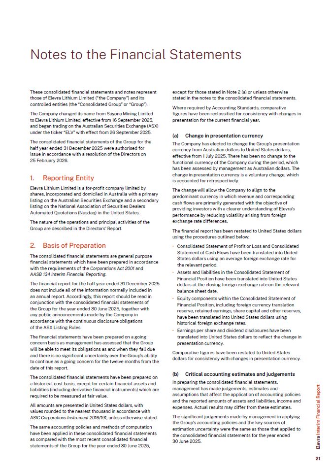 These consolidated financial statements and notes represent those of Elevra Lithium Limited (“the Company”) and its controlled entities (the “Consolidated Group” or “Group”).  The Company changed its name from Sayona Mining Limited to Elevra Lithium Limited, effective from 16 September 2025,  and began trading on the Australian Securities Exchange (ASX) under the ticker “ELV” with effect from 26 September 2025.  The consolidated financial statements of the Group for the half year ended 31 December 2025 were authorised for issue in accordance with a resolution of the Directors on 25 February 2026.  Reporting Entity  Elevra Lithium Limited is a for-profit company limited by shares, incorporated and domiciled in Australia with a primary listing on the Australian Securities Exchange and a secondary listing on the National Association of Securities Dealers Automated Quotations (Nasdaq) in the United States.  The nature of the operations and principal activities of the Group are described in the Directors’ Report.  Basis of Preparation  The consolidated financial statements are general purpose financial statements which have been prepared in accordance with the requirements of the Corporations Act 2001 and  AASB 134 Interim Financial Reporting.  The financial report for the half year ended 31 December 2025 does not include all of the information normally included in  an annual report. Accordingly, this report should be read in conjunction with the consolidated financial statements of the Group for the year ended 30 June 2025, together with any public announcements made by the Company in accordance with the continuous disclosure obligations  of the ASX Listing Rules.  The financial statements have been prepared on a going concern basis as management has assessed that the Group will be able to meet its obligations as and when they fall due and there is no significant uncertainty over the Group’s ability to continue as a going concern for the twelve months from the date of this report.  The consolidated financial statements have been prepared on a historical cost basis, except for certain financial assets and liabilities (including derivative financial instruments) which are required to be measured at fair value.  All amounts are presented in United States dollars, with values rounded to the nearest thousand in accordance with  ASIC Corporations Instrument 2016/191, unless otherwise stated.  The same accounting policies and methods of computation have been applied in these consolidated financial statements as compared with the most recent consolidated financial statements of the Group for the year ended 30 June 2025,  Notes to the Financial Statements  Elevra Interim Financial Report  except for those stated in Note 2 (a) or unless otherwise stated in the notes to the consolidated financial statements.  Where required by Accounting Standards, comparative figures have been reclassified for consistency with changes in presentation for the current financial year.  Change in presentation currency  The Company has elected to change the Group’s presentation currency from Australian dollars to United States dollars, effective from 1 July 2025. There has been no change to the functional currency of the Company during the period, which has been assessed by management as Australian dollars. The change in presentation currency is a voluntary change, which is accounted for retrospectively.  The change will allow the Company to align to the predominant currency in which revenue and corresponding cash flows are primarily generated with the objective of providing investors with a clearer understanding of Elevra’s performance by reducing volatility arising from foreign exchange rate differences.  The financial report has been restated to United States dollars using the procedures outlined below:  Consolidated Statement of Profit or Loss and Consolidated Statement of Cash Flows have been translated into United States dollars using an average foreign exchange rate for the relevant period.  Assets and liabilities in the Consolidated Statement of Financial Position have been translated into United States dollars at the closing foreign exchange rate on the relevant balance sheet date.  Equity components within the Consolidated Statement of Financial Position, including foreign currency translation reserve, retained earnings, share capital and other reserves, have been translated into United States dollars using historical foreign exchange rates.  Earnings per share and dividend disclosures have been translated into United States dollars to reflect the change in presentation currency.  Comparative figures have been restated to United States dollars for consistency with changes in presentation currency.  (b) Critical accounting estimates and judgements  In preparing the consolidated financial statements, management has made judgements, estimates and assumptions that affect the application of accounting policies and the reported amounts of assets and liabilities, income and expenses. Actual results may differ from these estimates.  The significant judgements made by management in applying the Group’s accounting policies and the key sources of estimation uncertainty were the same as those that applied to the consolidated financial statements for the year ended  30 June 2025.  21