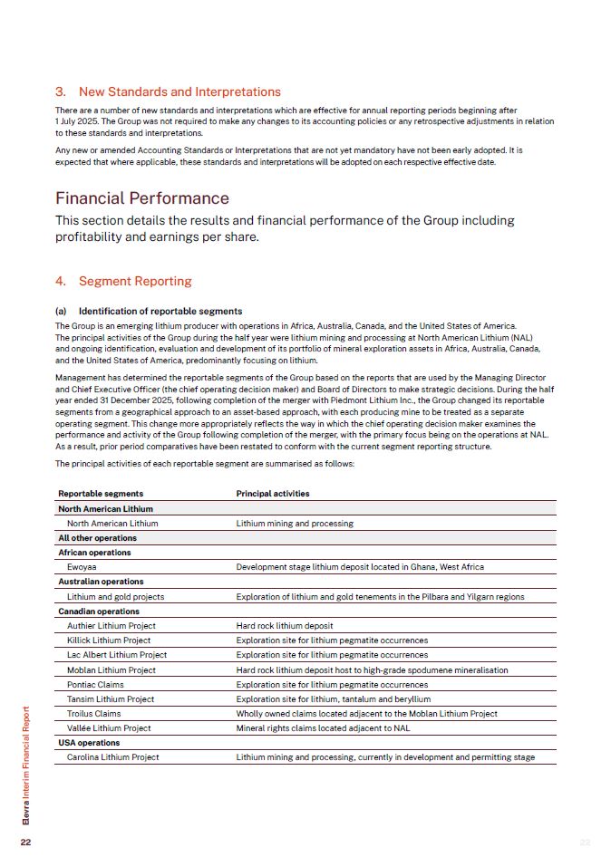 3. New Standards and Interpretations  There are a number of new standards and interpretations which are effective for annual reporting periods beginning after  1 July 2025. The Group was not required to make any changes to its accounting policies or any retrospective adjustments in relation to these standards and interpretations.  Any new or amended Accounting Standards or Interpretations that are not yet mandatory have not been early adopted. It is expected that where applicable, these standards and interpretations will be adopted on each respective effective date.  Financial Performance  This section details the results and financial performance of the Group including profitability and earnings per share.  4. Segment Reporting  (a) Identification of reportable segments  The Group is an emerging lithium producer with operations in Africa, Australia, Canada, and the United States of America. The principal activities of the Group during the half year were lithium mining and processing at North American Lithium (NAL)  and ongoing identification, evaluation and development of its portfolio of mineral exploration assets in Africa, Australia, Canada, and the United States of America, predominantly focusing on lithium.  Management has determined the reportable segments of the Group based on the reports that are used by the Managing Director and Chief Executive Officer (the chief operating decision maker) and Board of Directors to make strategic decisions. During the half year ended 31 December 2025, following completion of the merger with Piedmont Lithium Inc., the Group changed its reportable segments from a geographical approach to an asset-based approach, with each producing mine to be treated as a separate operating segment. This change more appropriately reflects the way in which the chief operating decision maker examines the performance and activity of the Group following completion of the merger, with the primary focus being on the operations at NAL. As a result, prior period comparatives have been restated to conform with the current segment reporting structure.  The principal activities of each reportable segment are summarised as follows:  Reportable segments  Principal activities  North American Lithium  North American Lithium  Lithium mining and processing  All other operations  African operations  Ewoyaa  Development stage lithium deposit located in Ghana, West Africa  Australian operations  Lithium and gold projects  Exploration of lithium and gold tenements in the Pilbara and Yilgarn regions  Canadian operations  Authier Lithium Project  Hard rock lithium deposit  Killick Lithium Project  Exploration site for lithium pegmatite occurrences  Lac Albert Lithium Project  Exploration site for lithium pegmatite occurrences  Moblan Lithium Project  Hard rock lithium deposit host to high-grade spodumene mineralisation  Pontiac Claims  Exploration site for lithium pegmatite occurrences  Tansim Lithium Project  Exploration site for lithium, tantalum and beryllium  Troilus Claims  Wholly owned claims located adjacent to the Moblan Lithium Project  Vallée Lithium Project  Mineral rights claims located adjacent to NAL  USA operations  Carolina Lithium Project  Lithium mining and processing, currently in development and permitting stage  Elevra Interim Financial Report  22  22