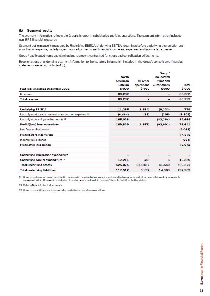 (b) Segment results  The segment information reflects the Group’s interest in subsidiaries and joint operations. The segment information includes non-IFRS financial measures.  Segment performance is measured by Underlying EBITDA. Underlying EBITDA is earnings before underlying depreciation and amortisation expense, underlying earnings adjustments, net financial income and expenses, and income tax expense.  Group / unallocated items and eliminations represent centralised functions and consolidation adjustments.  Reconciliations of underlying segment information to the statutory information included in the Group’s consolidated financial statements are set out in Note 4 (c).  Revenue  86,232  –  –  86,232  Total revenue  86,232  –  –  86,232  Underlying EBITDA  11,265  (1,154)  (9,332)  779  Underlying depreciation and amortisation expense (1)  (6,464)  (33)  (305)  (6,802)  Underlying earnings adjustments (2)  165,028  –  (82,364)  82,664  Profit/(loss) from operations  169,829  (1,187)  (92,001)  76,641  Net financial expense  (2,066)  Profit before income tax  74,575  Income tax expense  (634)  Profit after income tax  73,941  Underlying exploration expenditure  –  –  –  –  Underlying capital expenditure (3)  12,211  133  6  12,350  Total underlying assets  425,074  235,957  41,540  702,571  Total underlying liabilities  117,512  5,157  14,693  137,362  Half year ended 31 December 2025  North American Lithium  $’000  All other operations  $’000  Group / unallocated items and eliminations  $’000  Total  $’000  Underlying depreciation and amortisation expense is comprised of depreciation and amortisation expense and other non-cash inventory movements recognised within ‘Changes in inventories of finished goods and work in progress’. Refer to Note 6 for further details.  Refer to Note 4 (c) for further details.  Underlying capital expenditure excludes capitalised exploration expenditure.  Elevra Interim Financial Report  23
