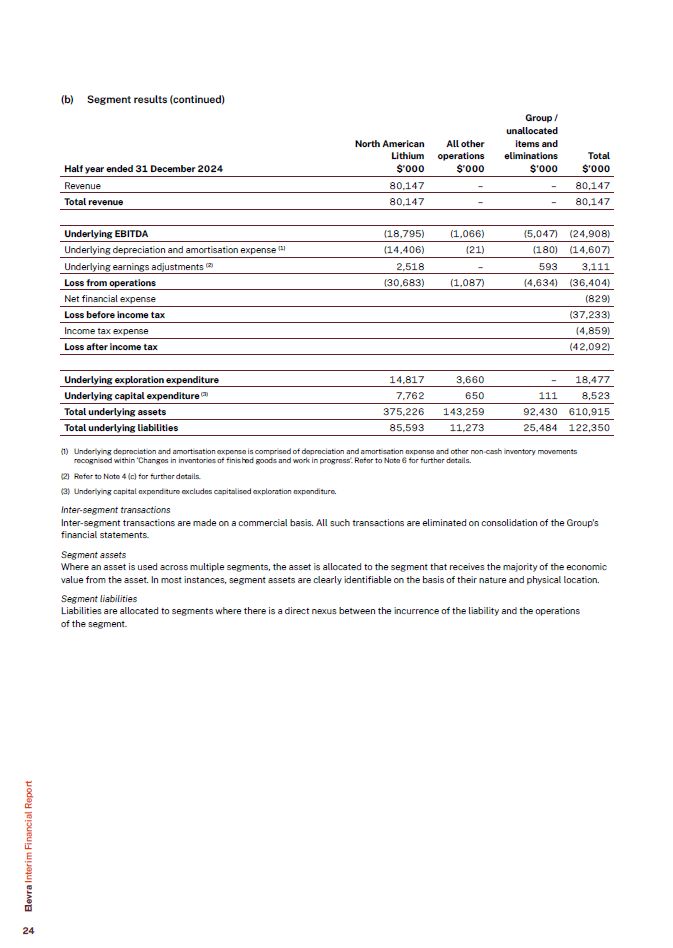 (b) Segment results (continued)  North American  All other  Group / unallocated items and  Half year ended 31 December 2024  Lithium  $’000  operations  $’000  eliminations  $’000  Total  $’000  Revenue  80,147  –  –  80,147  Total revenue  80,147  –  –  80,147  Underlying EBITDA  (18,795)  (1,066)  (5,047)  (24,908)  Underlying depreciation and amortisation expense (1)  (14,406)  (21)  (180)  (14,607)  Underlying earnings adjustments (2)  2,518  –  593  3,111  Loss from operations  (30,683)  (1,087)  (4,634)  (36,404)  Net financial expense  (829)  Loss before income tax  (37,233)  Income tax expense  (4,859)  Loss after income tax  (42,092)  Underlying exploration expenditure  14,817  3,660  –  18,477  Underlying capital expenditure (3)  7,762  650  111  8,523  Total underlying assets  375,226  143,259  92,430  610,915  Total underlying liabilities  85,593  11,273  25,484  122,350  Underlying depreciation and amortisation expense is comprised of depreciation and amortisation expense and other non-cash inventory movements recognised within ‘Changes in inventories of finished goods and work in progress’. Refer to Note 6 for further details.  Refer to Note 4 (c) for further details.  Underlying capital expenditure excludes capitalised exploration expenditure.  Inter-segment transactions  Inter-segment transactions are made on a commercial basis. All such transactions are eliminated on consolidation of the Group’s financial statements.  Segment assets  Where an asset is used across multiple segments, the asset is allocated to the segment that receives the majority of the economic value from the asset. In most instances, segment assets are clearly identifiable on the basis of their nature and physical location.  Segment liabilities  Liabilities are allocated to segments where there is a direct nexus between the incurrence of the liability and the operations of the segment.  Elevra Interim Financial Report  24