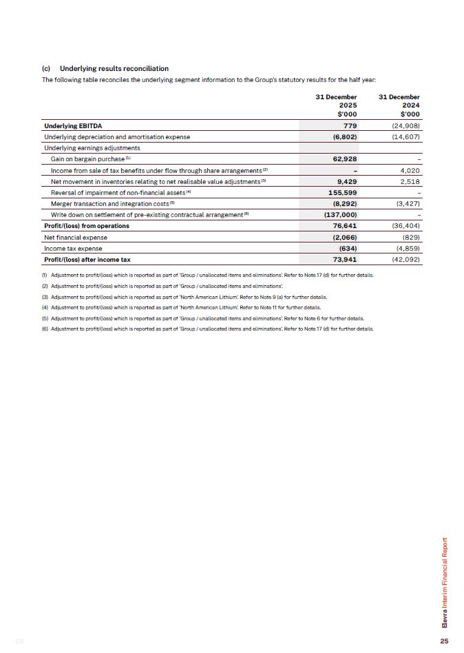 (c) Underlying results reconciliation  The following table reconciles the underlying segment information to the Group’s statutory results for the half year:  Underlying EBITDA  779  (24,908)  Underlying depreciation and amortisation expense  (6,802)  (14,607)  Underlying earnings adjustments  Gain on bargain purchase (1)  62,928  –  Income from sale of tax benefits under flow through share arrangements (2)  –  4,020  Net movement in inventories relating to net realisable value adjustments (3)  9,429  2,518  Reversal of impairment of non-financial assets (4)  155,599  –  Merger transaction and integration costs (5)  (8,292)  (3,427)  Write down on settlement of pre-existing contractual arrangement (6)  (137,000)  –  Profit/(loss) from operations  76,641  (36,404)  Net financial expense  (2,066)  (829)  Income tax expense  (634)  (4,859)  Profit/(loss) after income tax  73,941  (42,092)  31 December  2025  $’000  31 December  2024  $’000  Adjustment to profit/(loss) which is reported as part of ‘Group / unallocated items and eliminations’. Refer to Note 17 (d) for further details.  Adjustment to profit/(loss) which is reported as part of ‘Group / unallocated items and eliminations’.  Adjustment to profit/(loss) which is reported as part of ‘North American Lithium’. Refer to Note 9 (a) for further details.  Adjustment to profit/(loss) which is reported as part of ‘North American Lithium’. Refer to Note 11 for further details.  Adjustment to profit/(loss) which is reported as part of ‘Group / unallocated items and eliminations’. Refer to Note 6 for further details.  Adjustment to profit/(loss) which is reported as part of ‘Group / unallocated items and eliminations’. Refer to Note 17 (d) for further details.  Elevra Interim Financial Report  25  25