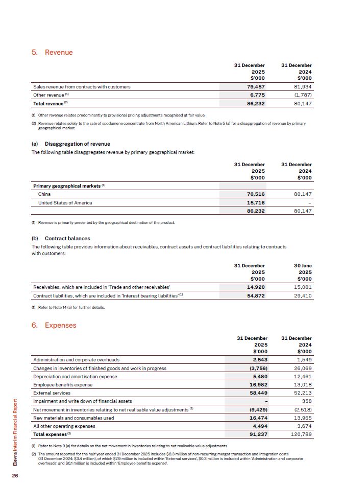 5. Revenue  Sales revenue from contracts with customers  79,457  81,934  Other revenue (1)  6,775  (1,787)  Total revenue (2)  86,232  80,147  31 December  2025  $’000  31 December  2024  $’000  Other revenue relates predominantly to provisional pricing adjustments recognised at fair value.  Revenue relates solely to the sale of spodumene concentrate from North American Lithium. Refer to Note 5 (a) for a disaggregation of revenue by primary geographical market.  Disaggregation of revenue  The following table disaggregates revenue by primary geographical market:  Primary geographical markets (1)  China  70,516  80,147  United States of America  15,716  –  86,232  80,147  31 December  2025  $’000  31 December  2024  $’000  (1) Revenue is primarily presented by the geographical destination of the product.  (b) Contract balances  The following table provides information about receivables, contract assets and contract liabilities relating to contracts with customers:  Receivables, which are included in ‘Trade and other receivables’  14,920  15,081  Contract liabilities, which are included in ‘Interest bearing liabilities’ (1)  54,872  29,410  31 December  2025  $’000  30 June  2025  $’000  (1) Refer to Note 14 (a) for further details.  6. Expenses  Administration and corporate overheads  2,543  1,549  Changes in inventories of finished goods and work in progress  (3,756)  26,069  Depreciation and amortisation expense  5,480  12,461  Employee benefits expense  16,982  13,018  External services  58,449  52,213  Impairment and write down of financial assets  –  358  Net movement in inventories relating to net realisable value adjustments (1)  (9,429)  (2,518)  Raw materials and consumables used  16,474  13,965  All other operating expenses  4,494  3,674  Total expenses (2)  91,237  120,789  31 December  2025  $’000  31 December  2024  $’000  Elevra Interim Financial Report  Refer to Note 9 (a) for details on the net movement in inventories relating to net realisable value adjustments.  The amount reported for the half year ended 31 December 2025 includes $8.3 million of non-recurring merger transaction and integration costs  (31 December 2024: $3.4 million), of which $7.9 million is included within ‘External services’, $0.3 million is included within ‘Administration and corporate overheads’ and $0.1 million is included within ‘Employee benefits expense’.  26