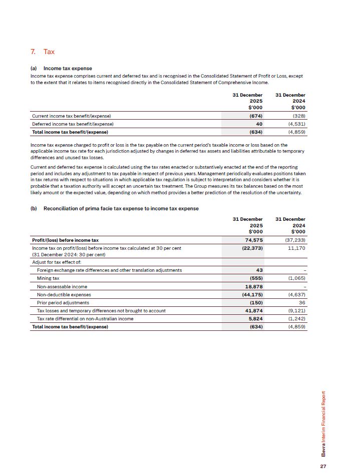 Tax  Income tax expense  Income tax expense comprises current and deferred tax and is recognised in the Consolidated Statement of Profit or Loss, except to the extent that it relates to items recognised directly in the Consolidated Statement of Comprehensive Income.  Current income tax benefit/(expense)  (674)  (328)  Deferred income tax benefit/(expense)  40  (4,531)  Total income tax benefit/(expense)  (634)  (4,859)  31 December  2025  $’000  31 December  2024  $’000  Income tax expense charged to profit or loss is the tax payable on the current period’s taxable income or loss based on the applicable income tax rate for each jurisdiction adjusted by changes in deferred tax assets and liabilities attributable to temporary differences and unused tax losses.  Current and deferred tax expense is calculated using the tax rates enacted or substantively enacted at the end of the reporting period and includes any adjustment to tax payable in respect of previous years. Management periodically evaluates positions taken in tax returns with respect to situations in which applicable tax regulation is subject to interpretation and considers whether it is probable that a taxation authority will accept an uncertain tax treatment. The Group measures its tax balances based on the most likely amount or the expected value, depending on which method provides a better prediction of the resolution of the uncertainty.  (b) Reconciliation of prima facie tax expense to income tax expense  Profit/(loss) before income tax  74,575  (37,233)  Income tax on profit/(loss) before income tax calculated at 30 per cent (31 December 2024: 30 per cent)  (22,373)  11,170  Adjust for tax effect of:  Foreign exchange rate differences and other translation adjustments  43  –  Mining tax  (555)  (1,065)  Non-assessable income  18,878  –  Non-deductible expenses  (44,175)  (4,637)  Prior period adjustments  (150)  36  Tax losses and temporary differences not brought to account  41,874  (9,121)  Tax rate differential on non-Australian income  5,824  (1,242)  Total income tax benefit/(expense)  (634)  (4,859)  31 December  2025  $’000  31 December  2024  $’000  Elevra Interim Financial Report  27