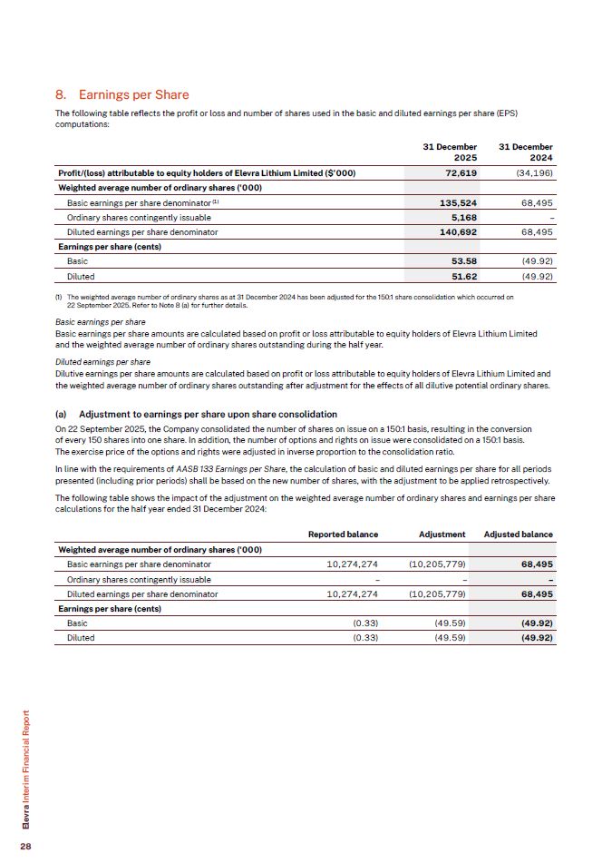 8. Earnings per Share  The following table reflects the profit or loss and number of shares used in the basic and diluted earnings per share (EPS) computations:  Profit/(loss) attributable to equity holders of Elevra Lithium Limited ($’000)  72,619  (34,196)  Weighted average number of ordinary shares (‘000)  Basic earnings per share denominator (1)  135,524  68,495  Ordinary shares contingently issuable  5,168  –  Diluted earnings per share denominator  140,692  68,495  Earnings per share (cents)  Basic  53.58  (49.92)  Diluted  51.62  (49.92)  31 December  2025  31 December  2024  The weighted average number of ordinary shares as at 31 December 2024 has been adjusted for the 150:1 share consolidation which occurred on 22 September 2025. Refer to Note 8 (a) for further details.  Basic earnings per share  Basic earnings per share amounts are calculated based on profit or loss attributable to equity holders of Elevra Lithium Limited and the weighted average number of ordinary shares outstanding during the half year.  Diluted earnings per share  Dilutive earnings per share amounts are calculated based on profit or loss attributable to equity holders of Elevra Lithium Limited and the weighted average number of ordinary shares outstanding after adjustment for the effects of all dilutive potential ordinary shares.  Adjustment to earnings per share upon share consolidation  On 22 September 2025, the Company consolidated the number of shares on issue on a 150:1 basis, resulting in the conversion of every 150 shares into one share. In addition, the number of options and rights on issue were consolidated on a 150:1 basis. The exercise price of the options and rights were adjusted in inverse proportion to the consolidation ratio.  In line with the requirements of AASB 133 Earnings per Share, the calculation of basic and diluted earnings per share for all periods presented (including prior periods) shall be based on the new number of shares, with the adjustment to be applied retrospectively.  The following table shows the impact of the adjustment on the weighted average number of ordinary shares and earnings per share calculations for the half year ended 31 December 2024:  Reported balance Adjustment Adjusted balance  Weighted average number of ordinary shares (‘000)  Basic earnings per share denominator  10,274,274  (10,205,779)  68,495  Ordinary shares contingently issuable  –  –  –  Diluted earnings per share denominator  10,274,274  (10,205,779)  68,495  Earnings per share (cents)  Basic  (0.33)  (49.59)  (49.92)  Diluted  (0.33)  (49.59)  (49.92)  Elevra Interim Financial Report  28