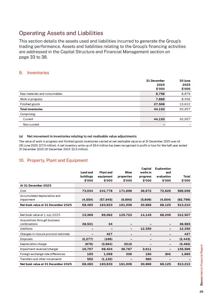 Operating Assets and Liabilities  This section details the assets used and liabilities incurred to generate the Group’s trading performance. Assets and liabilities relating to the Group’s financing activities are addressed in the Capital Structure and Financial Management section on  page 33 to 38.  9. Inventories  Raw materials and consumables  8,756  8,879  Work in progress  7,889  8,456  Finished goods  27,508  13,622  Total inventories  44,153  30,957  Comprising:  Current  44,153  30,957  Non-current  –  –  31 December  2025  $’000  30 June  2025  $’000  (a) Net movement in inventories relating to net realisable value adjustments  The value of work in progress and finished goods inventories carried at net realisable value as at 31 December 2025 was nil  (30 June 2025: $17.3 million). A net inventory write up of $9.4 million has been recognised in profit or loss for the half year ended 31 December 2025 (31 December 2024: $2.5 million).  10. Property, Plant and Equipment  Land and  Plant and  Mine  Capital  works in  Exploration  and  buildings  equipment  properties  progress  evaluation  Total  $’000  $’000  $’000  $’000  $’000  $’000  At 31 December 2025  Cost  73,034  241,778  171,896  36,672  72,629  596,009  Accumulated depreciation and impairment  (4,554)  (57,945)  (9,990)  (5,806)  (4,504)  (82,799)  Net book value at 31 December 2025  68,480  183,833  161,906  30,866  68,125  513,210  Net book value at 1 July 2025  15,368  89,062  125,723  14,145  68,209  312,507  Acquisitions through business combinations  38,531  34  –  –  –  38,565  Additions  –  –  –  12,350  –  12,350  Changes in closure provision estimate  –  427  –  –  –  427  Disposals  (2,277)  (166)  –  –  –  (2,443)  Depreciation charge  (676)  (3,894)  (910)  –  –  (5,480)  Impairment reversal/(charge)  16,797  98,404  36,787  3,611  –  155,599  Foreign exchange rate differences  185  1,098  306  180  (84)  1,685  Transfers and other movements  552  (1,132)  –  580  –  –  Net book value at 31 December 2025  68,480  183,833  161,906  30,866  68,125  513,210  Elevra Interim Financial Report  29