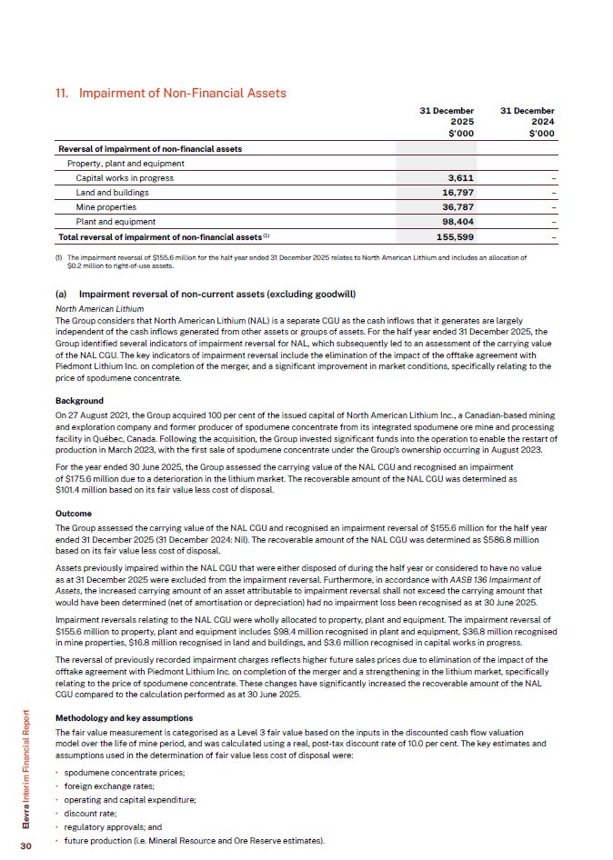 11. Impairment of Non-Financial Assets  Reversal of impairment of non-financial assets  Property, plant and equipment  Capital works in progress  3,611  –  Land and buildings  16,797  –  Mine properties  36,787  –  Plant and equipment  98,404  –  Total reversal of impairment of non-financial assets (1)  155,599  –  31 December  2025  $’000  31 December  2024  $’000  The impairment reversal of $155.6 million for the half year ended 31 December 2025 relates to North American Lithium and includes an allocation of  $0.2 million to right-of-use assets.  Impairment reversal of non-current assets (excluding goodwill)  North American Lithium  The Group considers that North American Lithium (NAL) is a separate CGU as the cash inflows that it generates are largely independent of the cash inflows generated from other assets or groups of assets. For the half year ended 31 December 2025, the Group identified several indicators of impairment reversal for NAL, which subsequently led to an assessment of the carrying value of the NAL CGU. The key indicators of impairment reversal include the elimination of the impact of the offtake agreement with Piedmont Lithium Inc. on completion of the merger, and a significant improvement in market conditions, specifically relating to the price of spodumene concentrate.  Background  On 27 August 2021, the Group acquired 100 per cent of the issued capital of North American Lithium Inc., a Canadian-based mining and exploration company and former producer of spodumene concentrate from its integrated spodumene ore mine and processing facility in Québec, Canada. Following the acquisition, the Group invested significant funds into the operation to enable the restart of production in March 2023, with the first sale of spodumene concentrate under the Group’s ownership occurring in August 2023.  For the year ended 30 June 2025, the Group assessed the carrying value of the NAL CGU and recognised an impairment of $175.6 million due to a deterioration in the lithium market. The recoverable amount of the NAL CGU was determined as  $101.4 million based on its fair value less cost of disposal.  Outcome  The Group assessed the carrying value of the NAL CGU and recognised an impairment reversal of $155.6 million for the half year ended 31 December 2025 (31 December 2024: Nil). The recoverable amount of the NAL CGU was determined as $586.8 million based on its fair value less cost of disposal.  Assets previously impaired within the NAL CGU that were either disposed of during the half year or considered to have no value as at 31 December 2025 were excluded from the impairment reversal. Furthermore, in accordance with AASB 136 Impairment of Assets, the increased carrying amount of an asset attributable to impairment reversal shall not exceed the carrying amount that would have been determined (net of amortisation or depreciation) had no impairment loss been recognised as at 30 June 2025.  Impairment reversals relating to the NAL CGU were wholly allocated to property, plant and equipment. The impairment reversal of  $155.6 million to property, plant and equipment includes $98.4 million recognised in plant and equipment, $36.8 million recognised in mine properties, $16.8 million recognised in land and buildings, and $3.6 million recognised in capital works in progress.  The reversal of previously recorded impairment charges reflects higher future sales prices due to elimination of the impact of the offtake agreement with Piedmont Lithium Inc. on completion of the merger and a strengthening in the lithium market, specifically relating to the price of spodumene concentrate. These changes have significantly increased the recoverable amount of the NAL CGU compared to the calculation performed as at 30 June 2025.  Methodology and key assumptions  The fair value measurement is categorised as a Level 3 fair value based on the inputs in the discounted cash flow valuation model over the life of mine period, and was calculated using a real, post-tax discount rate of 10.0 per cent. The key estimates and assumptions used in the determination of fair value less cost of disposal were:  spodumene concentrate prices;  foreign exchange rates;  operating and capital expenditure;  discount rate;  regulatory approvals; and  future production (i.e. Mineral Resource and Ore Reserve estimates).  Elevra Interim Financial Report  30