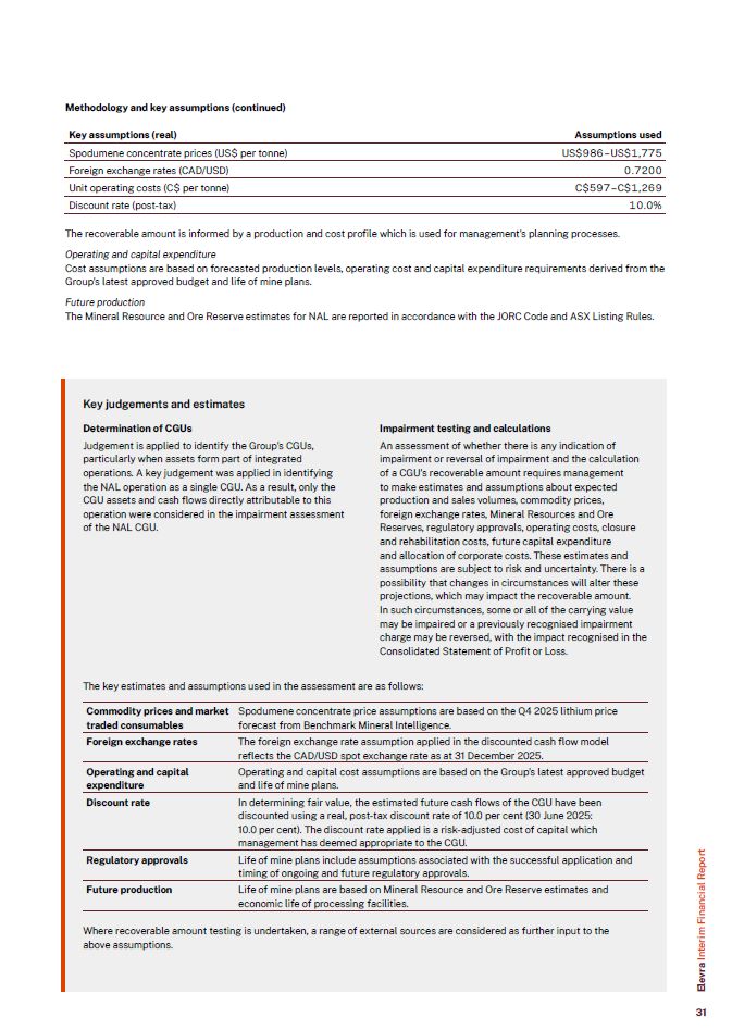 Methodology and key assumptions (continued)  Key assumptions (real)  Assumptions used  Spodumene concentrate prices (US$ per tonne)  US$986 –US$1,775  Foreign exchange rates (CAD/USD)  0.7200  Unit operating costs (C$ per tonne)  C$597 –C$1,269  Discount rate (post-tax) 10.0%  The recoverable amount is informed by a production and cost profile which is used for management’s planning processes.  Operating and capital expenditure  Cost assumptions are based on forecasted production levels, operating cost and capital expenditure requirements derived from the Group’s latest approved budget and life of mine plans.  Future production  The Mineral Resource and Ore Reserve estimates for NAL are reported in accordance with the JORC Code and ASX Listing Rules.  Key judgements and estimates  Determination of CGUs  Judgement is applied to identify the Group’s CGUs, particularly when assets form part of integrated operations. A key judgement was applied in identifying the NAL operation as a single CGU. As a result, only the CGU assets and cash flows directly attributable to this operation were considered in the impairment assessment of the NAL CGU.  Impairment testing and calculations  An assessment of whether there is any indication of impairment or reversal of impairment and the calculation of a CGU’s recoverable amount requires management  to make estimates and assumptions about expected production and sales volumes, commodity prices, foreign exchange rates, Mineral Resources and Ore Reserves, regulatory approvals, operating costs, closure and rehabilitation costs, future capital expenditure  and allocation of corporate costs. These estimates and assumptions are subject to risk and uncertainty. There is a possibility that changes in circumstances will alter these projections, which may impact the recoverable amount.  In such circumstances, some or all of the carrying value may be impaired or a previously recognised impairment charge may be reversed, with the impact recognised in the Consolidated Statement of Profit or Loss.  The key estimates and assumptions used in the assessment are as follows:  Commodity prices and market traded consumables  Spodumene concentrate price assumptions are based on the Q4 2025 lithium price forecast from Benchmark Mineral Intelligence.  Foreign exchange rates  The foreign exchange rate assumption applied in the discounted cash flow model reflects the CAD/USD spot exchange rate as at 31 December 2025.  Operating and capital expenditure  Operating and capital cost assumptions are based on the Group’s latest approved budget and life of mine plans.  Discount rate  In determining fair value, the estimated future cash flows of the CGU have been discounted using a real, post-tax discount rate of 10.0 per cent (30 June 2025: 10.0 per cent). The discount rate applied is a risk-adjusted cost of capital which management has deemed appropriate to the CGU.  Regulatory approvals  Life of mine plans include assumptions associated with the successful application and timing of ongoing and future regulatory approvals.  Future production  Life of mine plans are based on Mineral Resource and Ore Reserve estimates and economic life of processing facilities.  Where recoverable amount testing is undertaken, a range of external sources are considered as further input to the above assumptions.  Elevra Interim Financial Report  31