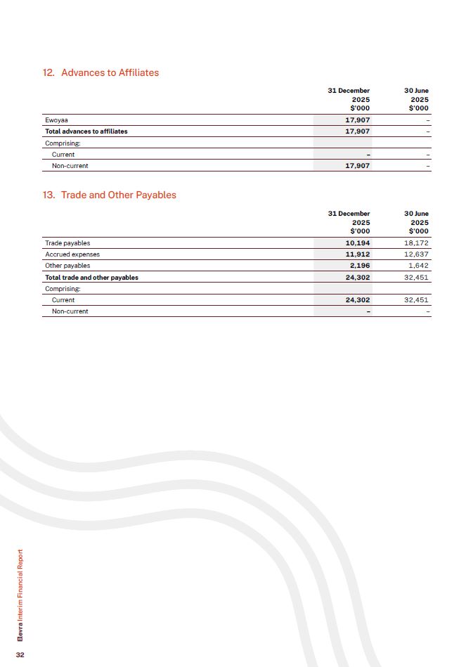 12. Advances to Affiliates  Ewoyaa  17,907  –  Total advances to affiliates  17,907  –  Comprising:  Current  –  –  Non-current  17,907  –  31 December  2025  $’000  30 June  2025  $’000  13. Trade and Other Payables  Trade payables  10,194  18,172  Accrued expenses  11,912  12,637  Other payables  2,196  1,642  Total trade and other payables  24,302  32,451  Comprising:  Current  24,302  32,451  Non-current  –  –  31 December  2025  $’000  30 June  2025  $’000  Elevra Interim Financial Report  32