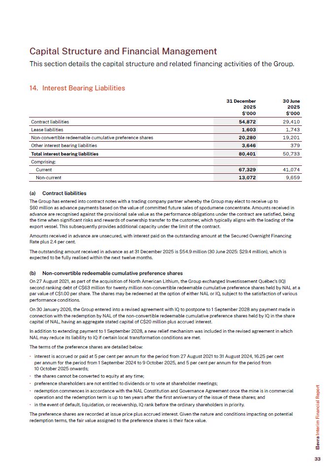 Capital Structure and Financial Management  This section details the capital structure and related financing activities of the Group.  14. Interest Bearing Liabilities  Contract liabilities  54,872  29,410  Lease liabilities  1,603  1,743  Non-convertible redeemable cumulative preference shares  20,280  19,201  Other interest bearing liabilities  3,646  379  Total interest bearing liabilities  80,401  50,733  Comprising:  Current  67,329  41,074  Non-current  13,072  9,659  31 December  2025  $’000  30 June  2025  $’000  Contract liabilities  The Group has entered into contract notes with a trading company partner whereby the Group may elect to receive up to  $60 million as advance payments based on the value of committed future sales of spodumene concentrate. Amounts received in advance are recognised against the provisional sale value as the performance obligations under the contract are satisfied, being the time when significant risks and rewards of ownership transfer to the customer, which typically aligns with the loading of the export vessel. This subsequently provides additional capacity under the limit of the contract.  Amounts received in advance are unsecured, with interest paid on the outstanding amount at the Secured Overnight Financing Rate plus 2.4 per cent.  The outstanding amount received in advance as at 31 December 2025 is $54.9 million (30 June 2025: $29.4 million), which is expected to be fully realised within the next twelve months.  Non-convertible redeemable cumulative preference shares  On 27 August 2021, as part of the acquisition of North American Lithium, the Group exchanged Investissement Québec's (IQ) second ranking debt of C$63 million for twenty million non-convertible redeemable cumulative preference shares held by NAL at a par value of C$1.00 per share. The shares may be redeemed at the option of either NAL or IQ, subject to the satisfaction of various performance conditions.  On 30 January 2026, the Group entered into a revised agreement with IQ to postpone to 1 September 2028 any payment made in connection with the redemption by NAL of the non-convertible redeemable cumulative preference shares held by IQ in the share capital of NAL, having an aggregate stated capital of C$20 million plus accrued interest.  In addition to extending payment to 1 September 2028, a new relief mechanism was included in the revised agreement in which NAL may reduce its liability to IQ if certain local transformation conditions are met.  The terms of the preference shares are detailed below:  interest is accrued or paid at 5 per cent per annum for the period from 27 August 2021 to 31 August 2024, 16.25 per cent per annum for the period from 1 September 2024 to 9 October 2025, and 5 per cent per annum for the period from  10 October 2025 onwards;  the shares cannot be converted to equity at any time;  preference shareholders are not entitled to dividends or to vote at shareholder meetings;  redemption commences in accordance with the NAL Constitution and Governance Agreement once the mine is in commercial operation and the redemption term is up to ten years after the first anniversary of the issue of these shares; and  in the event of default, liquidation, or receivership, IQ rank before the ordinary shareholders in priority.  The preference shares are recorded at issue price plus accrued interest. Given the nature and conditions impacting on potential redemption terms, the fair value assigned to the preference shares is their face value.  Elevra Interim Financial Report  33