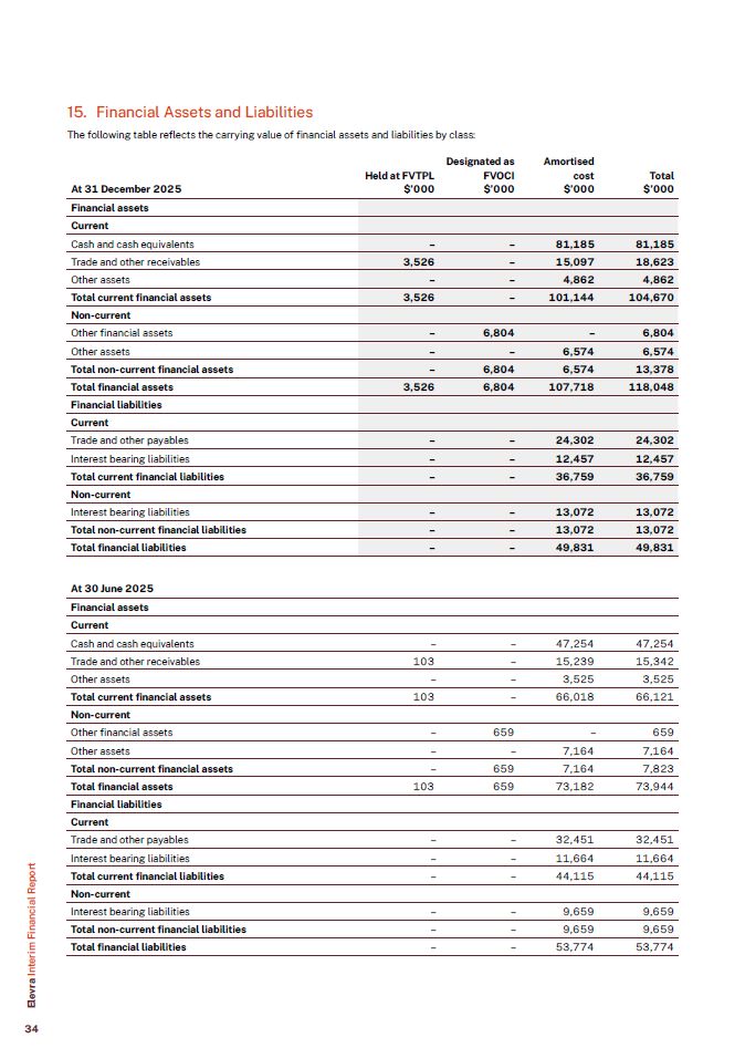 15. Financial Assets and Liabilities  The following table reflects the carrying value of financial assets and liabilities by class:  Financial assets  Current  Cash and cash equivalents  –  –  81,185  81,185  Trade and other receivables  3,526  –  15,097  18,623  Other assets  –  –  4,862  4,862  Total current financial assets  3,526  –  101,144  104,670  Non-current  Other financial assets  –  6,804  –  6,804  Other assets  –  –  6,574  6,574  Total non-current financial assets  –  6,804  6,574  13,378  Total financial assets  3,526  6,804  107,718  118,048  Financial liabilities  Current  Trade and other payables  –  –  24,302  24,302  Interest bearing liabilities  –  –  12,457  12,457  Total current financial liabilities  –  –  36,759  36,759  Non-current  Interest bearing liabilities  –  –  13,072  13,072  Total non-current financial liabilities  –  –  13,072  13,072  Total financial liabilities  –  –  49,831  49,831  At 30 June 2025  Financial assets  Current  Cash and cash equivalents  –  –  47,254  47,254  Trade and other receivables  103  –  15,239  15,342  Other assets  –  –  3,525  3,525  Total current financial assets  103  –  66,018  66,121  Non-current  Other financial assets  –  659  –  659  Other assets  –  –  7,164  7,164  Total non-current financial assets  –  659  7,164  7,823  Total financial assets  103  659  73,182  73,944  Financial liabilities  Current  Trade and other payables  –  –  32,451  32,451  Interest bearing liabilities  –  –  11,664  11,664  Total current financial liabilities  –  –  44,115  44,115  Non-current  Interest bearing liabilities  –  –  9,659  9,659  Total non-current financial liabilities  –  –  9,659  9,659  Total financial liabilities  –  –  53,774  53,774  At 31 December 2025  Held at FVTPL  $’000  Designated as  FVOCI  $’000  Amortised  cost  $’000  Total  $’000  Elevra Interim Financial Report  34