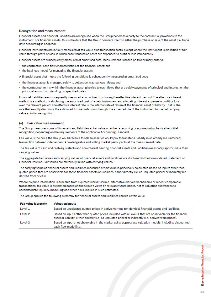 Recognition and measurement  Financial assets and financial liabilities are recognised when the Group becomes a party to the contractual provisions to the instrument. For financial assets, this is the date that the Group commits itself to either the purchase or sale of the asset (i.e. trade date accounting is adopted).  Financial instruments are initially measured at fair value plus transaction costs, except where the instrument is classified at fair value through profit or loss, in which case transaction costs are expensed to profit or loss immediately.  Financial assets are subsequently measured at amortised cost. Measurement is based on two primary criteria:  the contractual cash flow characteristics of the financial asset; and  the business model for managing the financial assets.  A financial asset that meets the following conditions is subsequently measured at amortised cost:  the financial asset is managed solely to collect contractual cash flows; and  the contractual terms within the financial asset give rise to cash flows that are solely payments of principal and interest on the principal amount outstanding on specified dates.  Financial liabilities are subsequently measured at amortised cost using the effective interest method. The effective interest method is a method of calculating the amortised cost of a debt instrument and allocating interest expense in profit or loss over the relevant period. The effective interest rate is the internal rate of return of the financial asset or liability. That is, the rate that exactly discounts the estimated future cash flows through the expected life of the instrument to the net carrying value at initial recognition.  (a) Fair value measurement  The Group measures some of its assets and liabilities at fair value on either a recurring or non-recurring basis after initial recognition, depending on the requirements of the applicable Accounting Standard.  Fair value is the price the Group would receive to sell an asset or would pay to transfer a liability in an orderly (i.e. unforced) transaction between independent, knowledgeable and willing market participants at the measurement date.  The fair value of cash and cash equivalents and non-interest bearing financial assets and liabilities reasonably approximate their carrying values.  The aggregate fair values and carrying values of financial assets and liabilities are disclosed in the Consolidated Statement of Financial Position. Fair values are materially in line with carrying values.  The carrying value of financial assets and liabilities measured at fair value is principally calculated based on inputs other than quoted prices that are observable for these financial assets or liabilities, either directly (i.e. as unquoted prices) or indirectly (i.e. derived from prices).  Where no price information is available from a quoted market source, alternative market mechanisms or recent comparable transactions, fair value is estimated based on the Group’s views on relevant future prices, net of valuation allowances to accommodate liquidity, modelling and other risks implicit in such estimates.  The Group applies the following hierarchy for financial assets and liabilities carried at fair value:  Fair value hierarchy Valuation inputs  Level 1 Based on unadjusted quoted prices in active markets for identical financial assets and liabilities.  Level 2  Based on inputs other than quoted prices included within Level 1 that are observable for the financial asset or liability, either directly (i.e. as unquoted prices) or indirectly (i.e. derived from prices).  Level 3  Based on inputs not observable in the market using appropriate valuation models, including discounted cash flow modelling.  Elevra Interim Financial Report  35