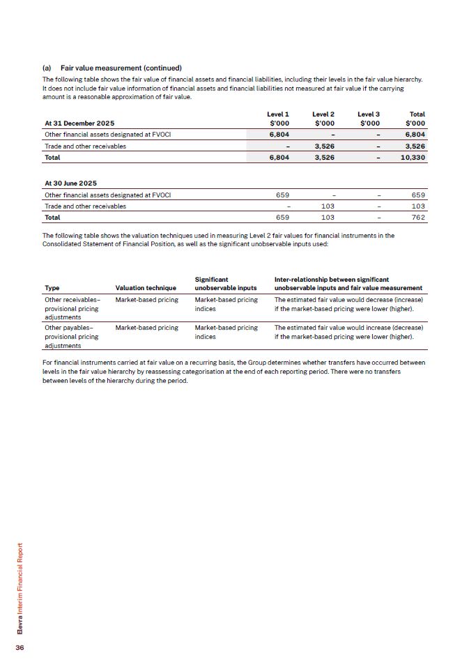 (a) Fair value measurement (continued)  The following table shows the fair value of financial assets and financial liabilities, including their levels in the fair value hierarchy. It does not include fair value information of financial assets and financial liabilities not measured at fair value if the carrying amount is a reasonable approximation of fair value.  At 30 June 2025  Other financial assets designated at FVOCI  659  –  –  659  Trade and other receivables  –  103  –  103  Total  659  103  –  762  Level 1  Level 2  Level 3  Total  At 31 December 2025  $’000  $’000  $’000  $’000  Other financial assets designated at FVOCI  6,804  –  –  6,804  Trade and other receivables  –  3,526  –  3,526  Total  6,804  3,526  –  10,330  The following table shows the valuation techniques used in measuring Level 2 fair values for financial instruments in the Consolidated Statement of Financial Position, as well as the significant unobservable inputs used:  Type  Valuation technique  Significant unobservable inputs  Inter-relationship between significant unobservable inputs and fair value measurement  Other receivables–provisional pricing adjustments  Market-based pricing  Market-based pricing indices  The estimated fair value would decrease (increase) if the market-based pricing were lower (higher).  Other payables–provisional pricing adjustments  Market-based pricing  Market-based pricing indices  The estimated fair value would increase (decrease) if the market-based pricing were lower (higher).  For financial instruments carried at fair value on a recurring basis, the Group determines whether transfers have occurred between levels in the fair value hierarchy by reassessing categorisation at the end of each reporting period. There were no transfers between levels of the hierarchy during the period.  Elevra Interim Financial Report  36