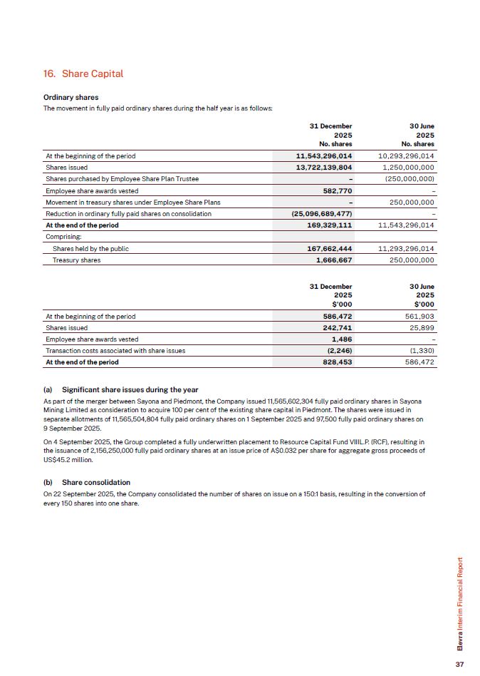16. Share Capital  Ordinary shares  The movement in fully paid ordinary shares during the half year is as follows:  At the beginning of the period  11,543,296,014  10,293,296,014  Shares issued  13,722,139,804  1,250,000,000  Shares purchased by Employee Share Plan Trustee  –  (250,000,000)  Employee share awards vested  582,770  –  Movement in treasury shares under Employee Share Plans  –  250,000,000  Reduction in ordinary fully paid shares on consolidation  (25,096,689,477)  –  At the end of the period  169,329,111  11,543,296,014  Comprising:  Shares held by the public  167,662,444  11,293,296,014  Treasury shares  1,666,667  250,000,000  At the beginning of the period  586,472  561,903  Shares issued  242,741  25,899  Employee share awards vested  1,486  –  Transaction costs associated with share issues  (2,246)  (1,330)  At the end of the period  828,453  586,472  31 December  2025  No. shares  30 June  2025  No. shares  31 December  2025  $’000  30 June  2025  $’000  Significant share issues during the year  As part of the merger between Sayona and Piedmont, the Company issued 11,565,602,304 fully paid ordinary shares in Sayona Mining Limited as consideration to acquire 100 per cent of the existing share capital in Piedmont. The shares were issued in separate allotments of 11,565,504,804 fully paid ordinary shares on 1 September 2025 and 97,500 fully paid ordinary shares on 9 September 2025.  On 4 September 2025, the Group completed a fully underwritten placement to Resource Capital Fund VIIIL.P. (RCF), resulting in the issuance of 2,156,250,000 fully paid ordinary shares at an issue price of A$0.032 per share for aggregate gross proceeds of US$45.2 million.  Share consolidation  On 22 September 2025, the Company consolidated the number of shares on issue on a 150:1 basis, resulting in the conversion of every 150 shares into one share.  Elevra Interim Financial Report  37