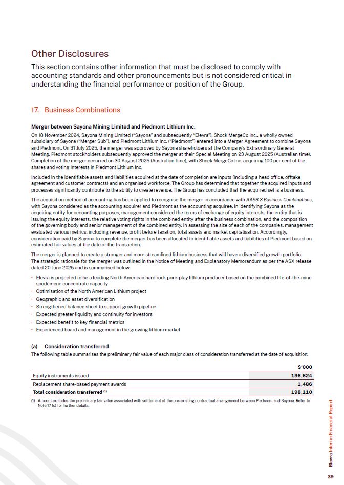 Other Disclosures  This section contains other information that must be disclosed to comply with accounting standards and other pronouncements but is not considered critical in understanding the financial performance or position of the Group.  17. Business Combinations  Merger between Sayona Mining Limited and Piedmont Lithium Inc.  On 18 November 2024, Sayona Mining Limited (“Sayona” and subsequently “Elevra”), Shock MergeCo Inc., a wholly owned subsidiary of Sayona (“Merger Sub”), and Piedmont Lithium Inc. (“Piedmont”) entered into a Merger Agreement to combine Sayona and Piedmont. On 31 July 2025, the merger was approved by Sayona shareholders at the Company’s Extraordinary General Meeting. Piedmont stockholders subsequently approved the merger at their Special Meeting on 23 August 2025 (Australian time). Completion of the merger occurred on 30 August 2025 (Australian time), with Shock MergeCo Inc. acquiring 100 per cent of the shares and voting interests in Piedmont Lithium Inc.  Included in the identifiable assets and liabilities acquired at the date of completion are inputs (including a head office, offtake agreement and customer contracts) and an organised workforce. The Group has determined that together the acquired inputs and processes significantly contribute to the ability to create revenue. The Group has concluded that the acquired set is a business.  The acquisition method of accounting has been applied to recognise the merger in accordance with AASB 3 Business Combinations, with Sayona considered as the accounting acquirer and Piedmont as the accounting acquiree. In identifying Sayona as the acquiring entity for accounting purposes, management considered the terms of exchange of equity interests, the entity that is issuing the equity interests, the relative voting rights in the combined entity after the business combination, and the composition  of the governing body and senior management of the combined entity. In assessing the size of each of the companies, management evaluated various metrics, including revenue, profit before taxation, total assets and market capitalisation. Accordingly, consideration paid by Sayona to complete the merger has been allocated to identifiable assets and liabilities of Piedmont based on estimated fair values at the date of the transaction.  The merger is planned to create a stronger and more streamlined lithium business that will have a diversified growth portfolio.  The strategic rationale for the merger was outlined in the Notice of Meeting and Explanatory Memorandum as per the ASX release dated 20 June 2025 and is summarised below:  Elevra is projected to be a leading North American hard rock pure-play lithium producer based on the combined life-of-the-mine spodumene concentrate capacity  Optimisation of the North American Lithium project  Geographic and asset diversification  Strengthened balance sheet to support growth pipeline  Expected greater liquidity and continuity for investors  Expected benefit to key financial metrics  Experienced board and management in the growing lithium market  (a) Consideration transferred  The following table summarises the preliminary fair value of each major class of consideration transferred at the date of acquisition:  $‘000  Equity instruments issued  196,624  Replacement share-based payment awards  1,486  Total consideration transferred (1)  198,110  (1) Amount excludes the preliminary fair value associated with settlement of the pre-existing contractual arrangement between Piedmont and Sayona. Refer to Note 17 (c) for further details.  Elevra Interim Financial Report  39